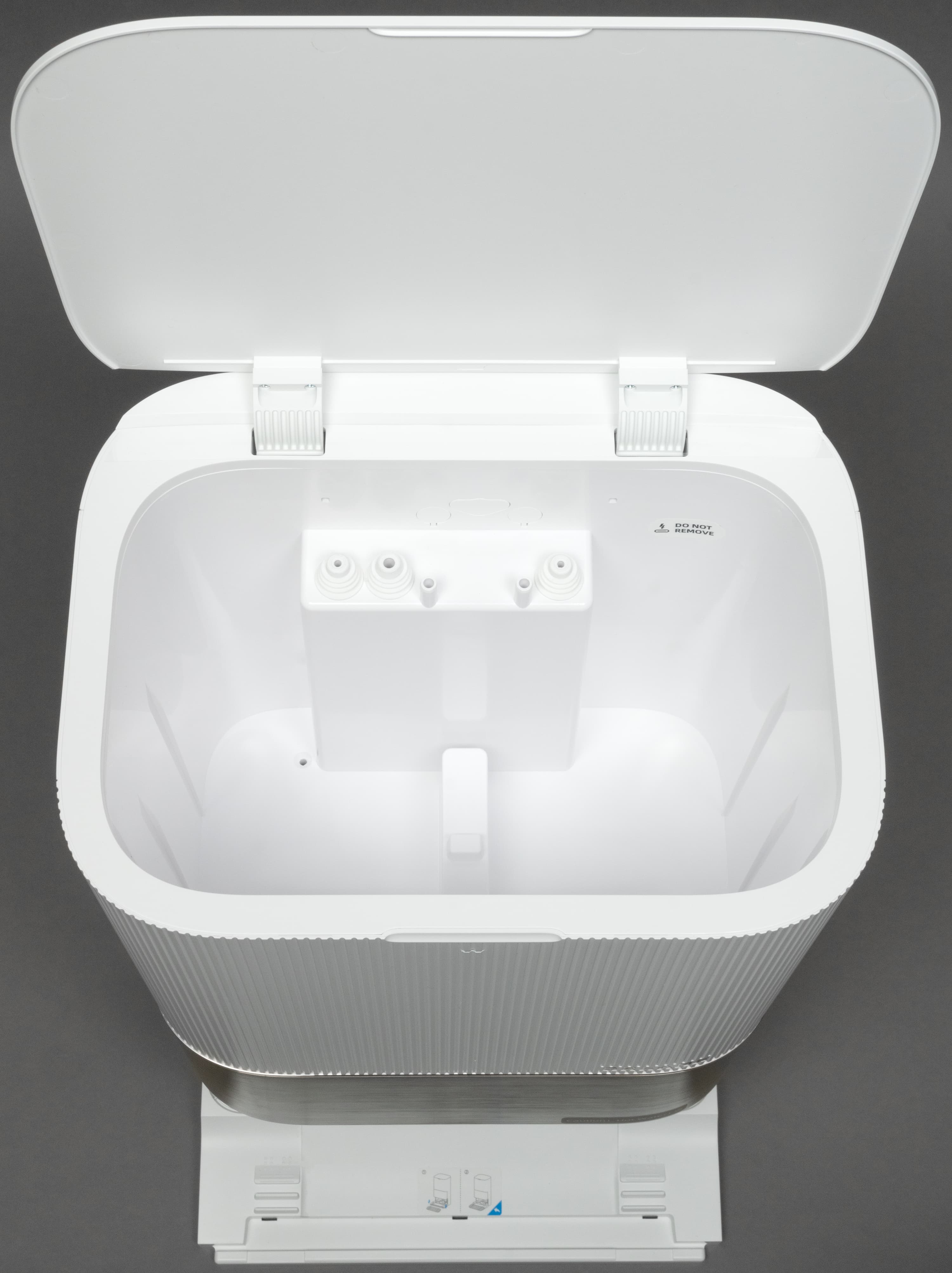 Если извлечь контейнер, то на его корпусе можно увидеть два дополнительных отверстия, через которые осуществляется высасывание мусора в недра станции самоочистки.