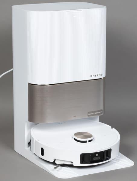 Базовая станция оборудована большой консолью для заезда робота. По центру парковочной ниши расположены контакты для зарядки, по бокам — два отверстия, через которые происходит самоочистка (сброс мусора). Между зарядными контактами — разъем автоматической дозаправки пылесоса чистой водой. Снизу — два небольших отверстия для ухода за швабрами.