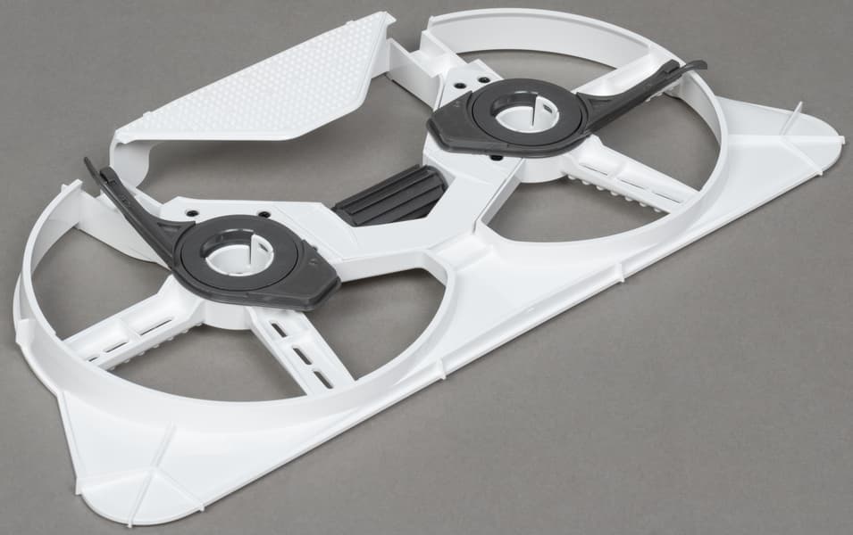 У ходовой части нашего робота используется традиционная конструкция. Робот приводится в движение двумя ведущими колесами, а в дополнение к ним в передней части есть третье, опорное. Шаг подвески ведущих колес составляет от 7 до 36 мм. Выраженные протекторы обеспечивают хорошее сцепление со всеми видами напольных покрытий.