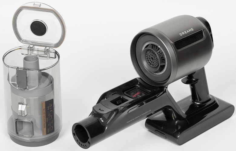 Компоновка пылесоса традиционная для устройств Dreame. Пылесос сделан по продольной схеме: цилиндрический корпус мусоросборника с циклонным фильтром размещен параллельно воздушному тракту. В точке соединения с контейнером поток воздуха с пылью и мусором разворачивается на 180° и закручивается вокруг циклона.