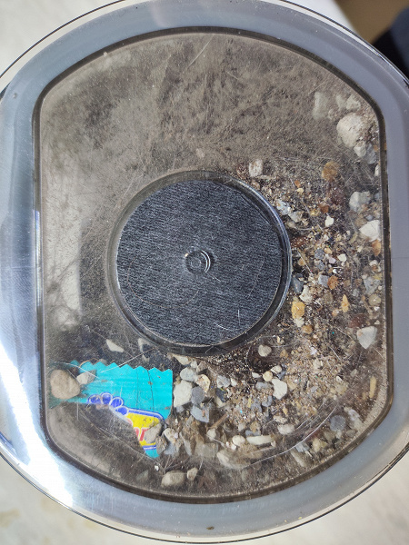 Пройдемся по участкам с крупным мусором и посмотрим, как справится пылесос с этой задачей. Результат — отлично. В контейнере мы увидели и обрывки бумажных упаковок, и (что нас особенно порадовало) крупные гранулы наполнителя для кошачьего туалета.