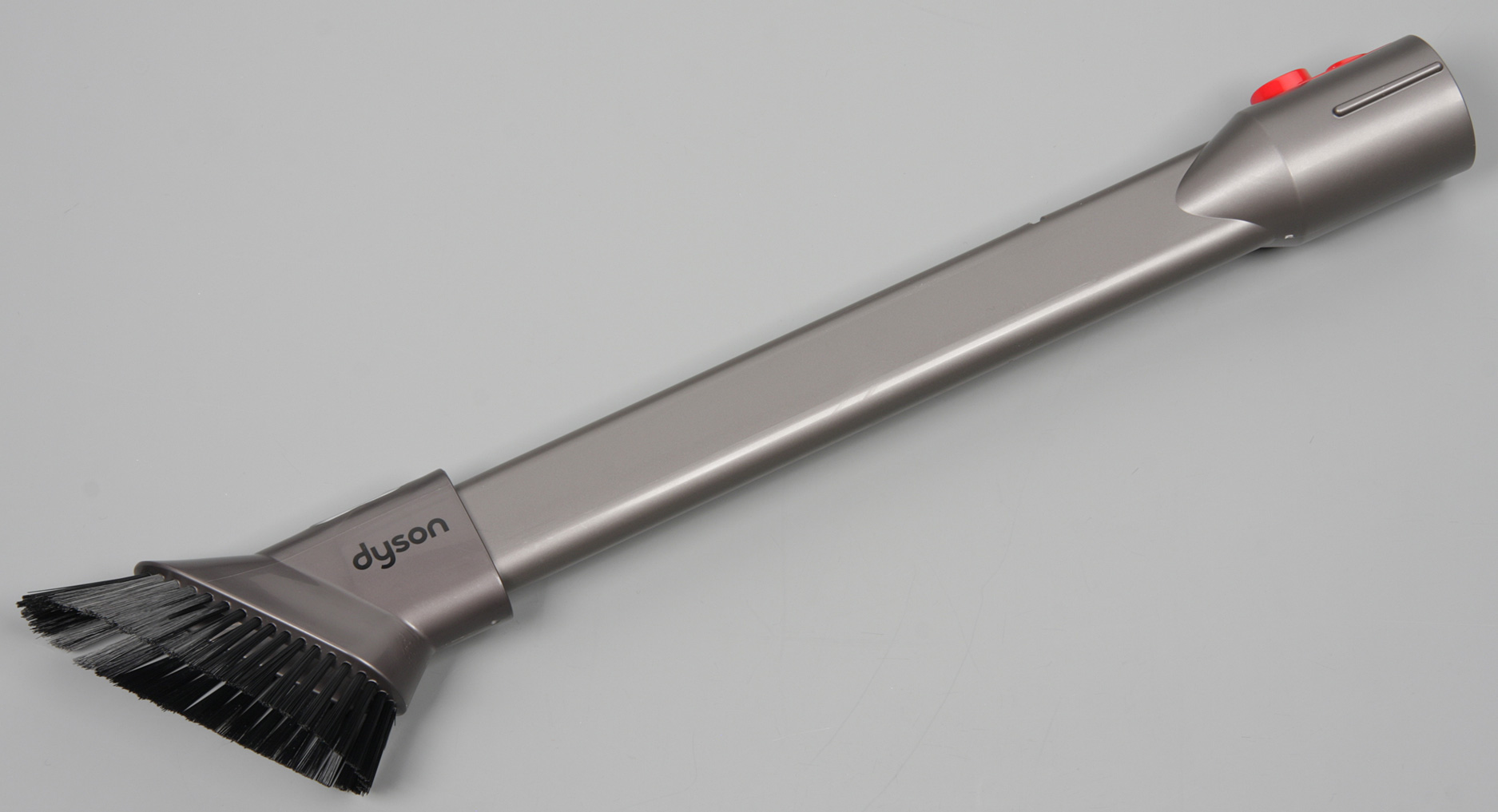 Носик насадки достаточно длинный, чтобы забираться в потаенные места накопления пыли, и с рядом отверстий на боковой поверхности, помогающих сохранять необходимый для работы циклонов и охлаждения мотора поток воздуха при полном перекрытии входного отверстия насадки.