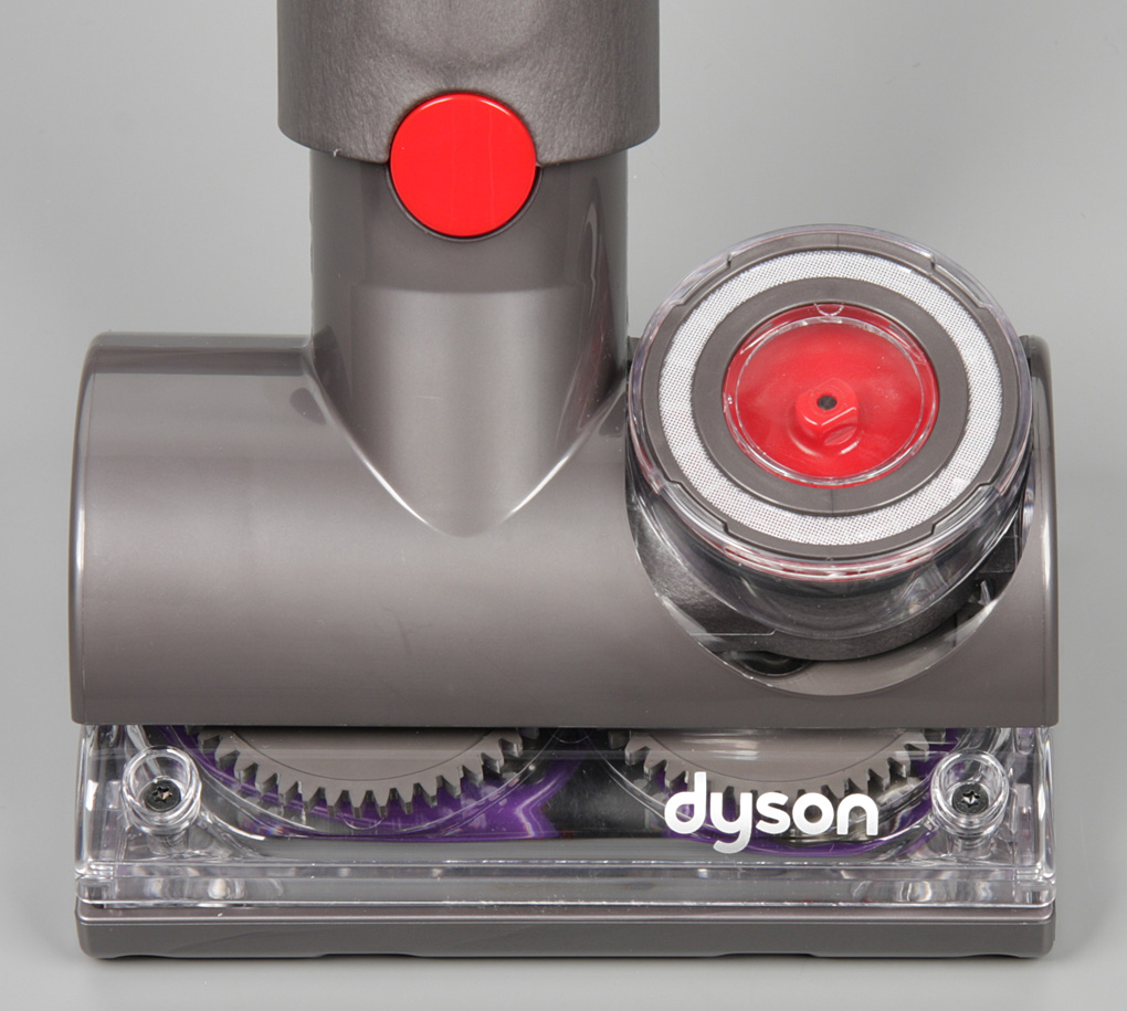 Вращение от турбинки через редуктор передается на щетку. Воздух для вращения турбинки забирается отдельно от основного потока через сетчатый фильтр сбоку на корпусе насадки. Щетка имеет четыре ряда щетинок. При этом черные ряды сформированы из мягких щетинок из углеродного волокна, хорошо сохраняющего форму, а красные — из нейлоновых щетинок потолще и пожестче. При работе прозрачный колпак позволяет определить, вращается ли щетка, а в перерывах видно, сколько и чего на щетку намоталось и не пора ли ее почистить. Насадка оснащена шарниром с двумя степенями свободы — отклонение по вертикали примерно на 60° и свободное вращение вдоль трубы. Кожух насадки может немного отклоняться относительно корпуса, что помогает сохранять плотный контакт с полом при перемещении насадки. Эту щетку можно подсовывать под протяженные предметы обстановки с просветом где-то 82 мм. При ширине насадки в 266 мм рабочая ширина составляет 227 мм (по длине щетины на щетке). На корпус насадки наклеена велюровая полоска, предохраняющая поверхность пола от царапин, а спереди есть упругая накладка, образующая предохранительный для мебели бампер. Скользить щетке по полу помогают четыре небольших ролика и колеса-крышки на шарнире. Покрышки роликов и сами колеса изготовлены из упругого пластика.