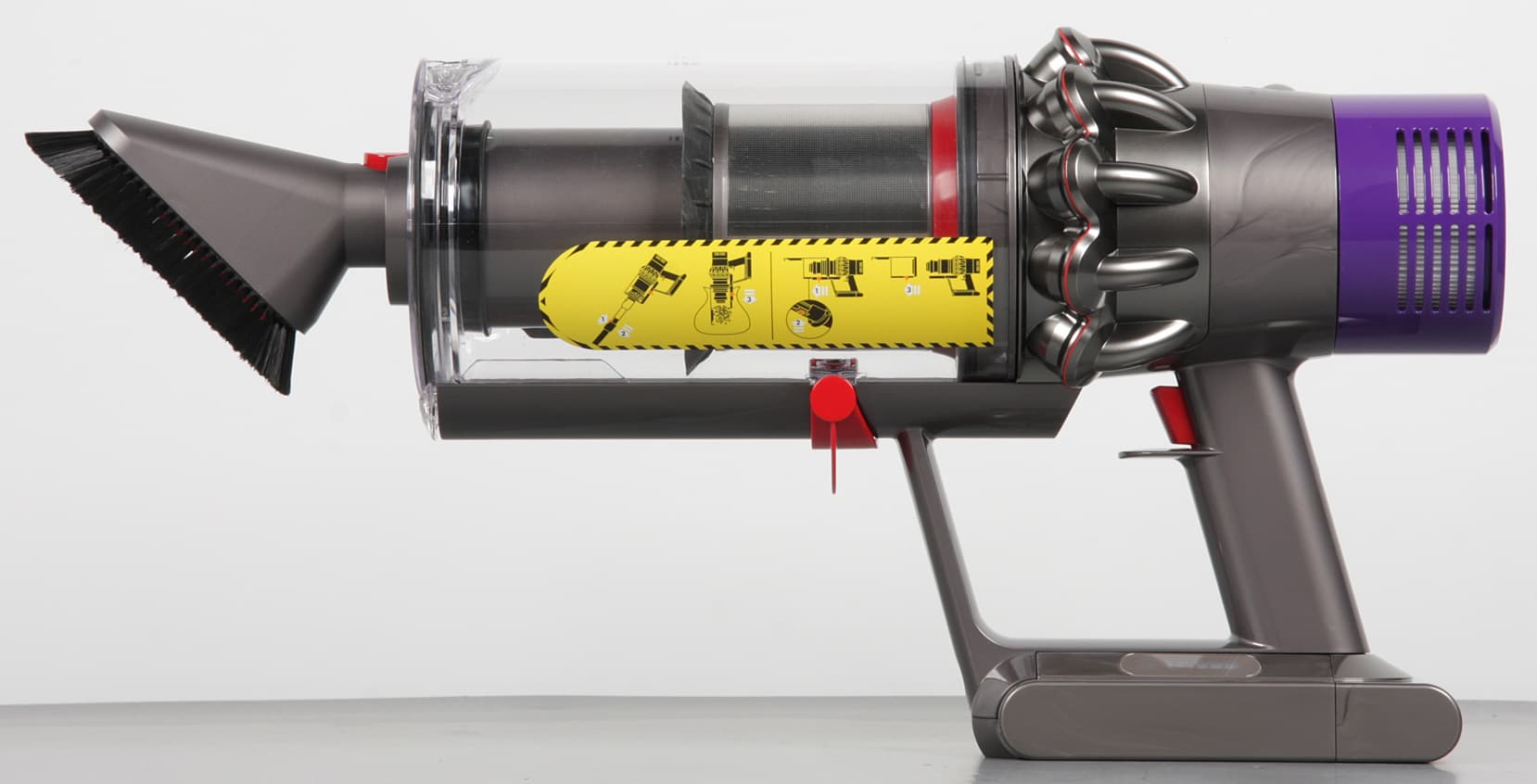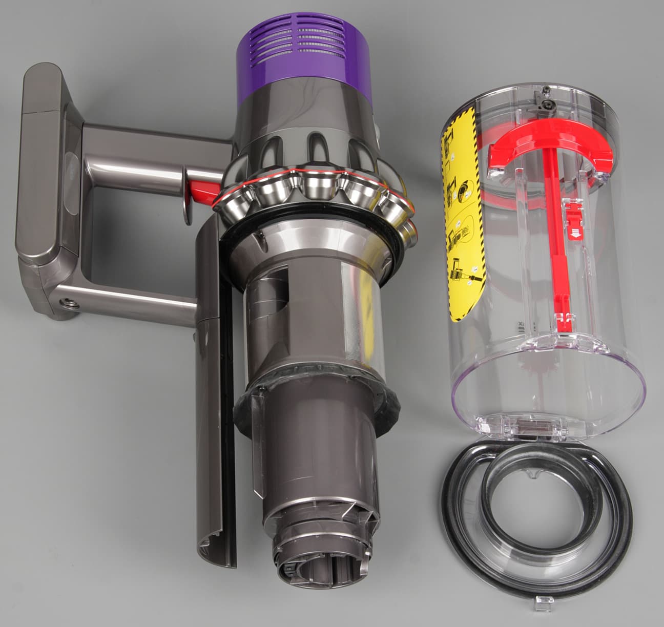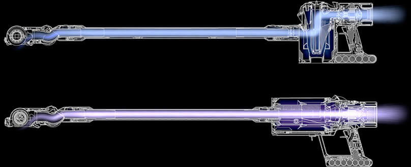 В предыдущих моделях аккумуляторных пылесосов Dyson пылесборник ориентирован перпендикулярно трубе или подсоединенным насадкам (для примера — V8):