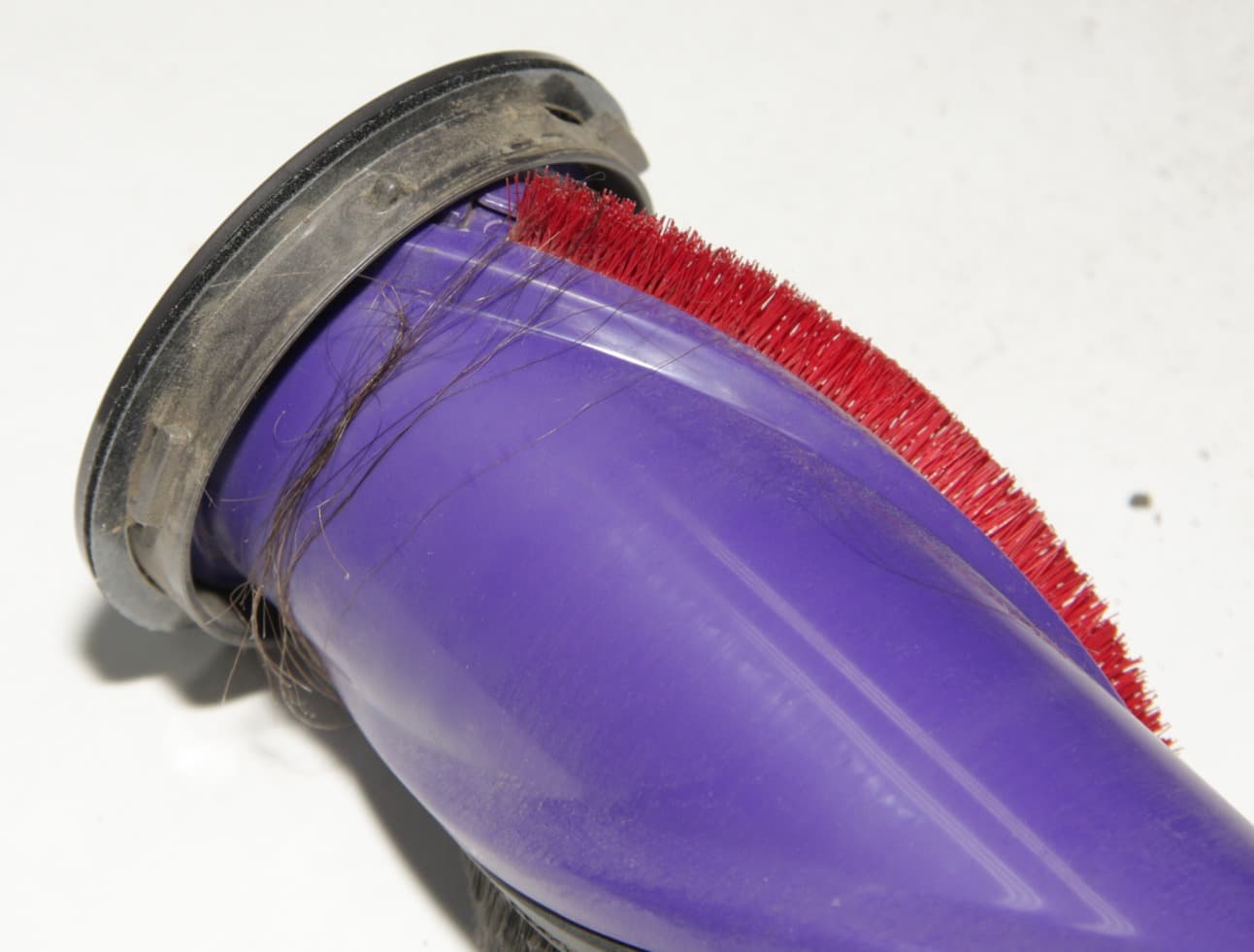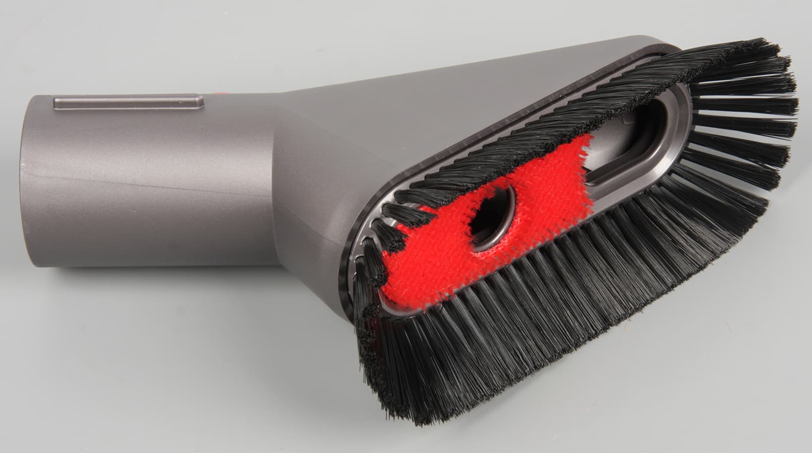 Она достаточно длинная (213 мм), чтобы забираться в потаенные места накопления пыли, и с рядом отверстий на боковой поверхности, помогающих сохранять необходимый для работы циклонов и охлаждения мотора поток воздуха при полном перекрытии входного отверстия насадки. Длина от кончика щелевой насадки с установленной трубой до кнопки включения составляет больше метра (116 см), то есть на столько пользователь может максимально удлинить свою руку при использовании этого пылесоса. Вторая насадка — это комбинированная насадка с входным отверстием пошире и со сдвижной щеткой из относительно длинной и нежесткой нейлоновой щетины.