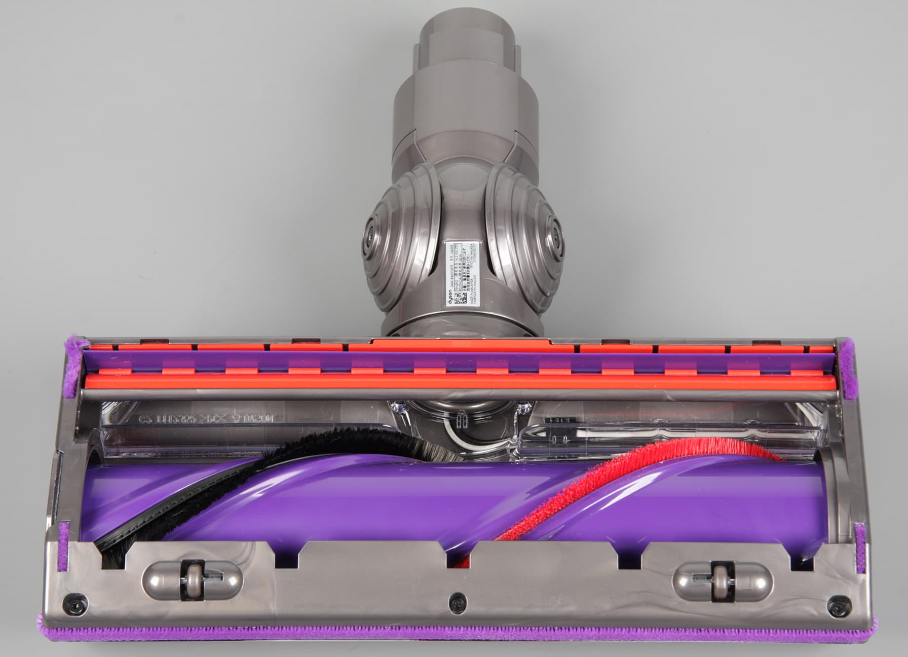 Электропривод размещен внутри самой щетки. Это позволило сделать торцы минимальной ширины, в итоге при ширине щетки в 251 мм рабочая ширина составляет 228 мм с примерно равными отступами по бокам. На корпус насадки наклеены велюровые полоски, снизу помогающие сохранять необходимый поток воздуха на гладких поверхностях (не дают щетке присасываться намертво) и предохраняющие поверхность пола от царапин, а спереди образующие предохранительный для мебели бампер. Скребок из упругого пластика снизу на заднем торце обеспечивает плотное прилегание насадки на не очень ровных полах. Скользить щетке по полу помогают два небольших ролика с покрышками из упругого материала.