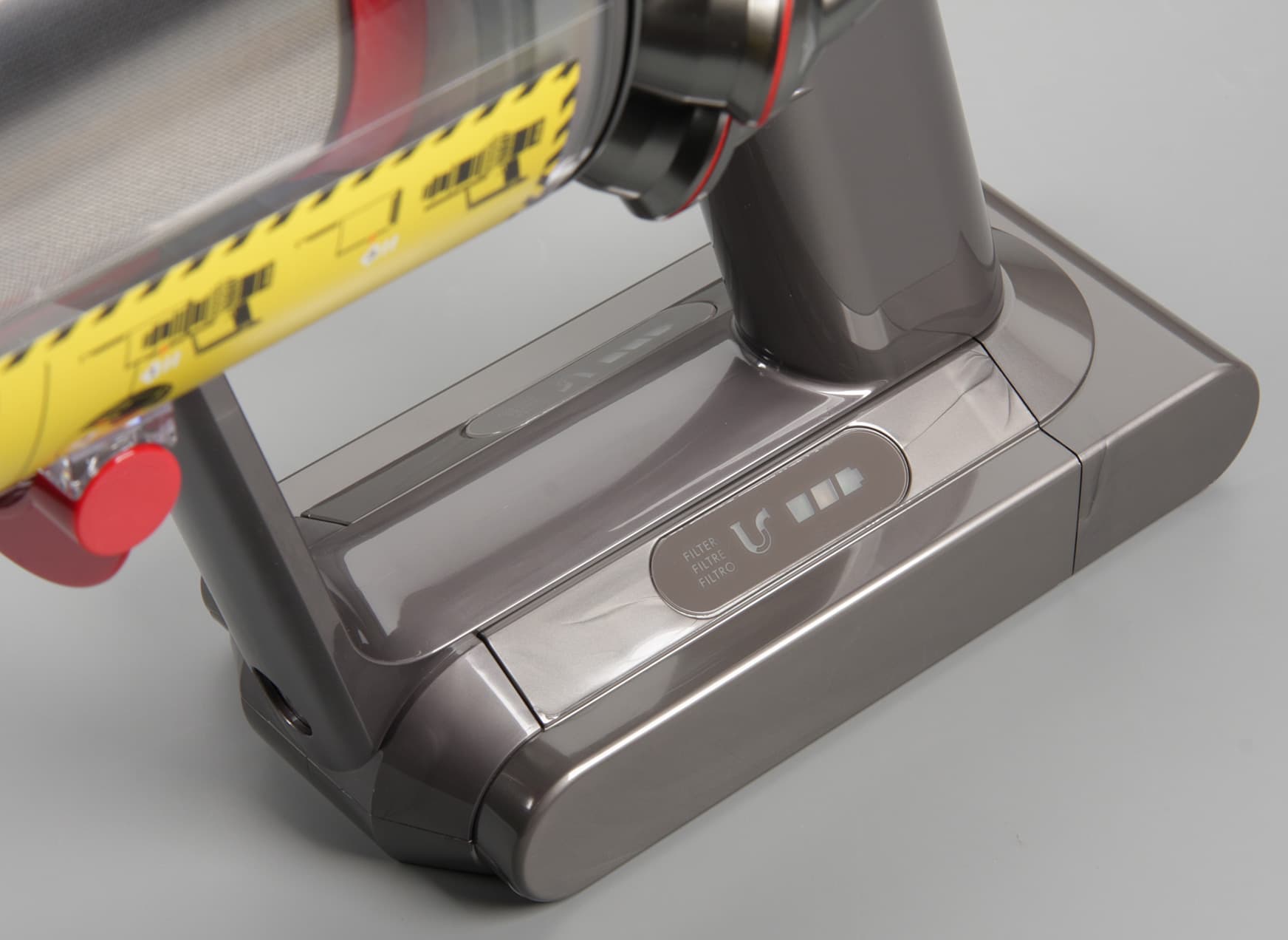По обе стороны от рукоятки на блоке аккумулятора есть индикаторы состояния. При работе и зарядке количество светящихся синим сегментов индикатора батареи указывает на текущий уровень заряда батареи, а красный цвет указывает на какие-то проблемы с батареей или самим пылесосом. Индикаторы фильтра обозначают, что фильтр нужно промыть или что он неправильно установлен/отсутствует, а по индикаторам засора можно определить, что его нужно устранить. С этими двумя новыми индикаторами пользователю стало проще разобраться, что не так с пылесосом.