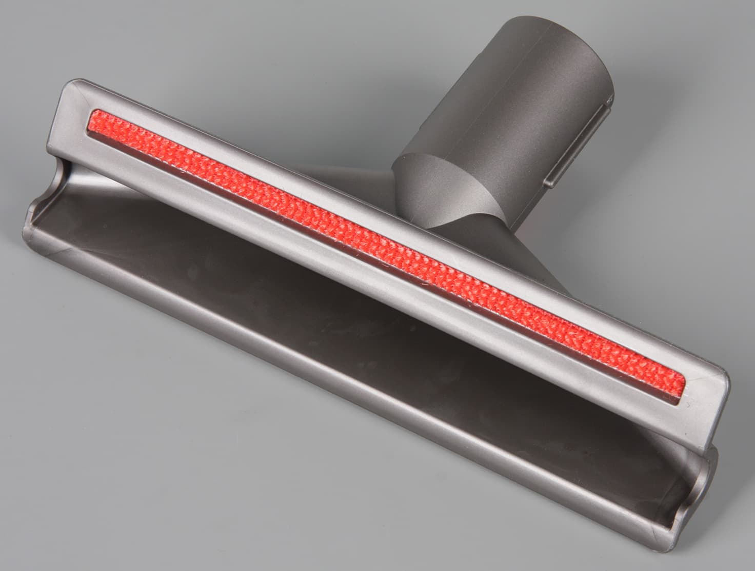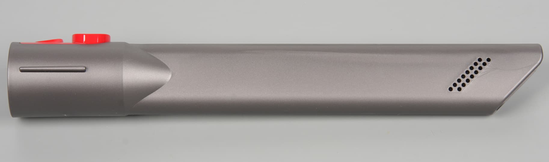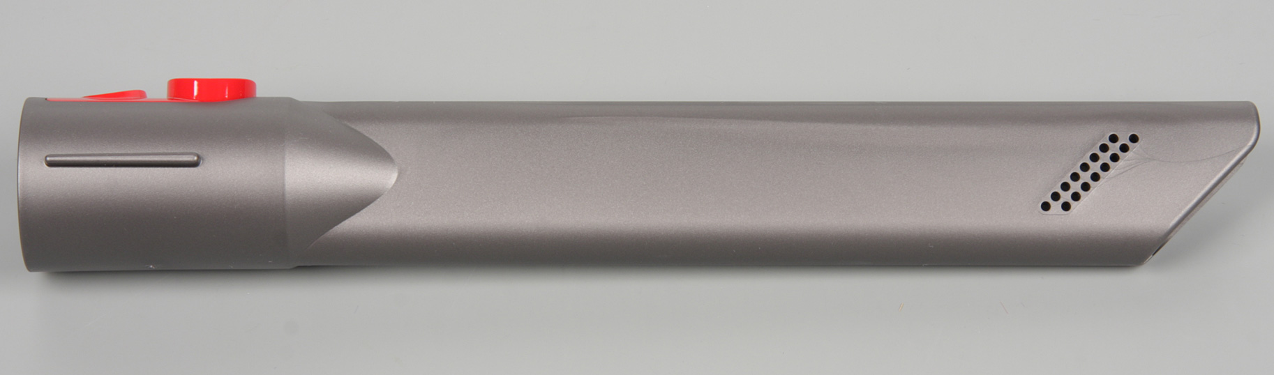 Принципиально новых насадок к данному пылесосу не прилагается. Все типы насадок мы уже встречали в комплектах к аккумуляторным пылесосам Dyson предыдущих поколений. В частности, некоторые незначительные различия в насадках для V8 и V10 могут быть выявлены только при тщательном сравнении. По креплению насадки для V8 и V10 полностью совместимы. Простых (без мотора) насадки три. Первая — это типичная щелевая.