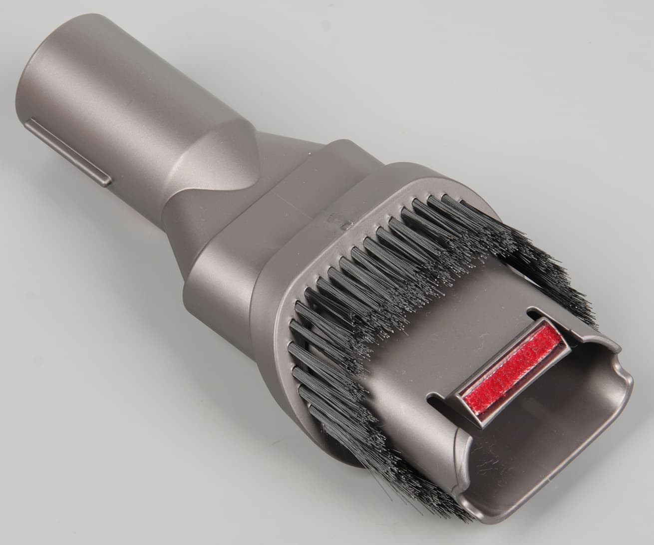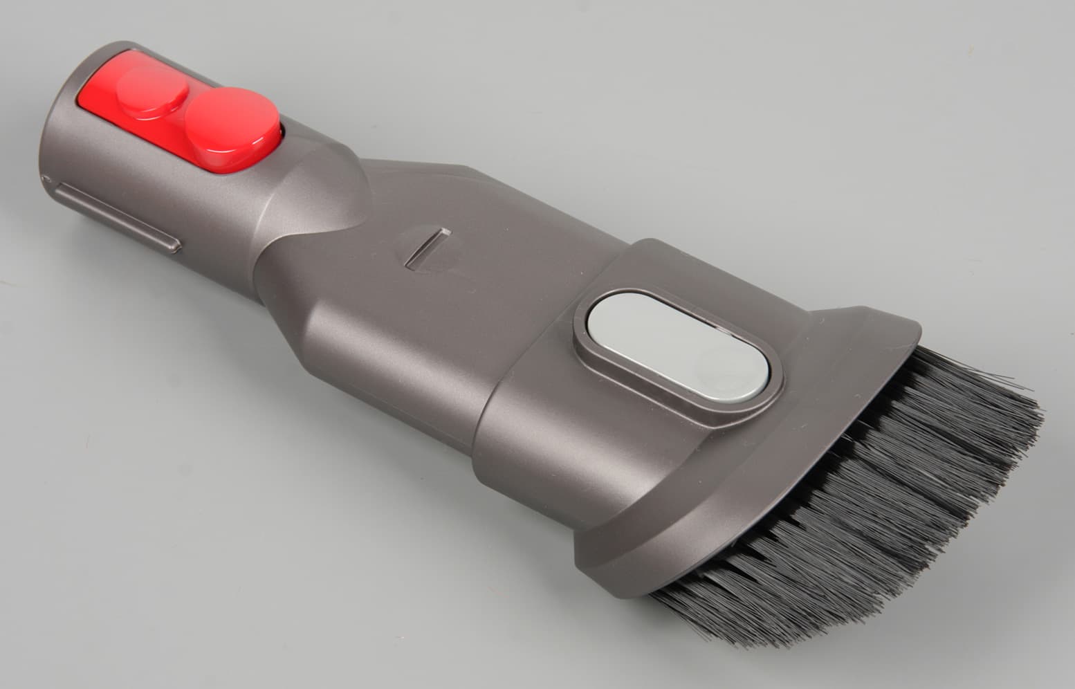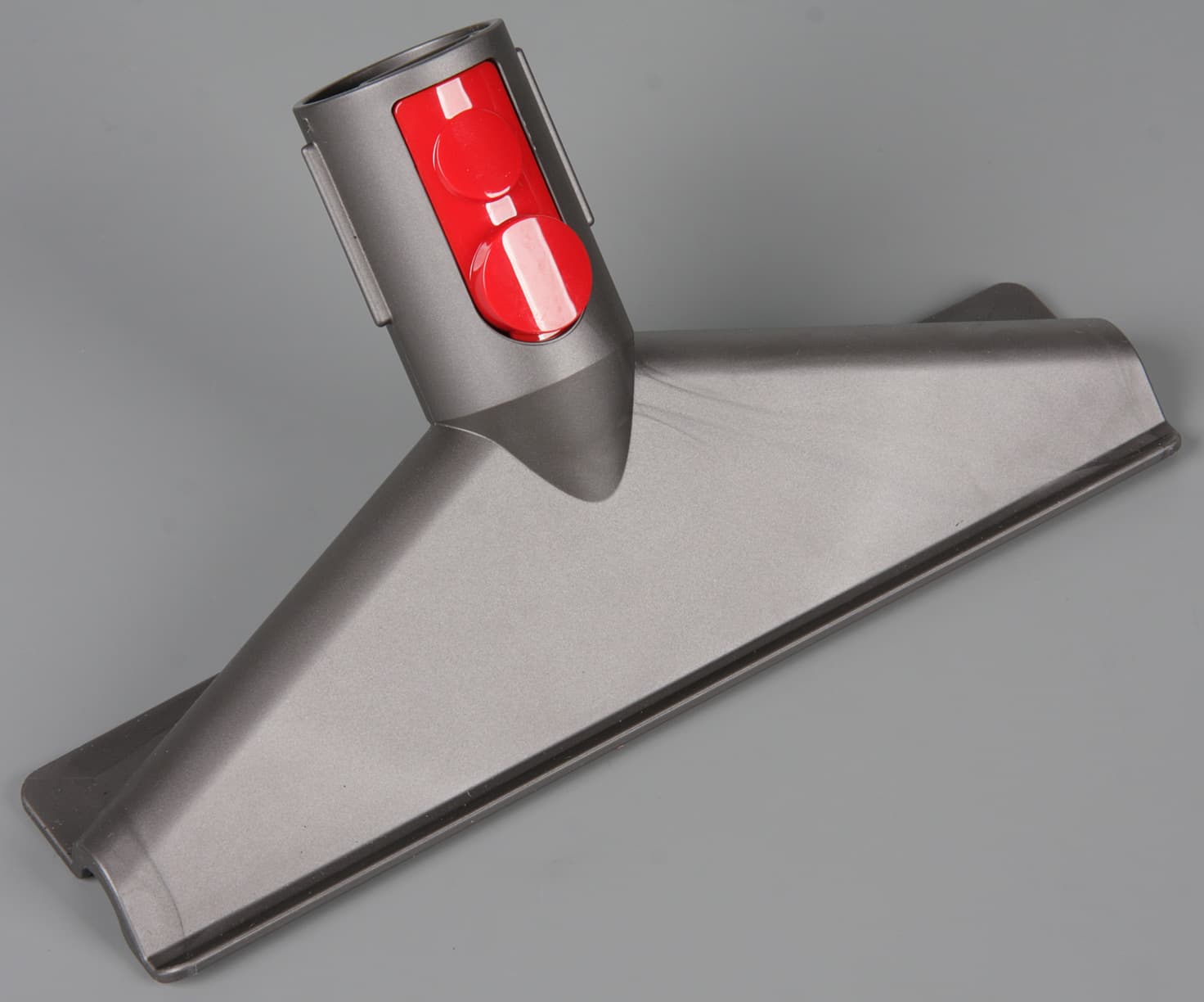 Принципиально новых насадок к данному пылесосу не прилагается. Все типы насадок мы уже встречали в комплектах к аккумуляторным пылесосам Dyson предыдущих поколений. В частности, некоторые незначительные различия в насадках для V8 и V10 могут быть выявлены только при тщательном сравнении. По креплению насадки для V8 и V10 полностью совместимы. Простых (без мотора) насадки три. Первая — это типичная щелевая.
