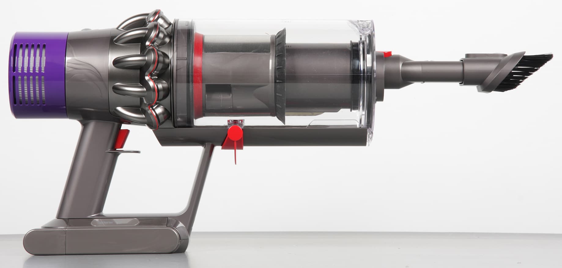 Такое расположение мотора, рукоятки и аккумулятора приближает центр тяжести к руке пользователя. Однако в случае V10 выступающий далеко вперед пылесборник, перевешивает, особенно, когда в нем скапливается много мусора. В итоге приходится тратить больше усилий, чтобы удерживать пылесос горизонтально или с подъемом вверх.
