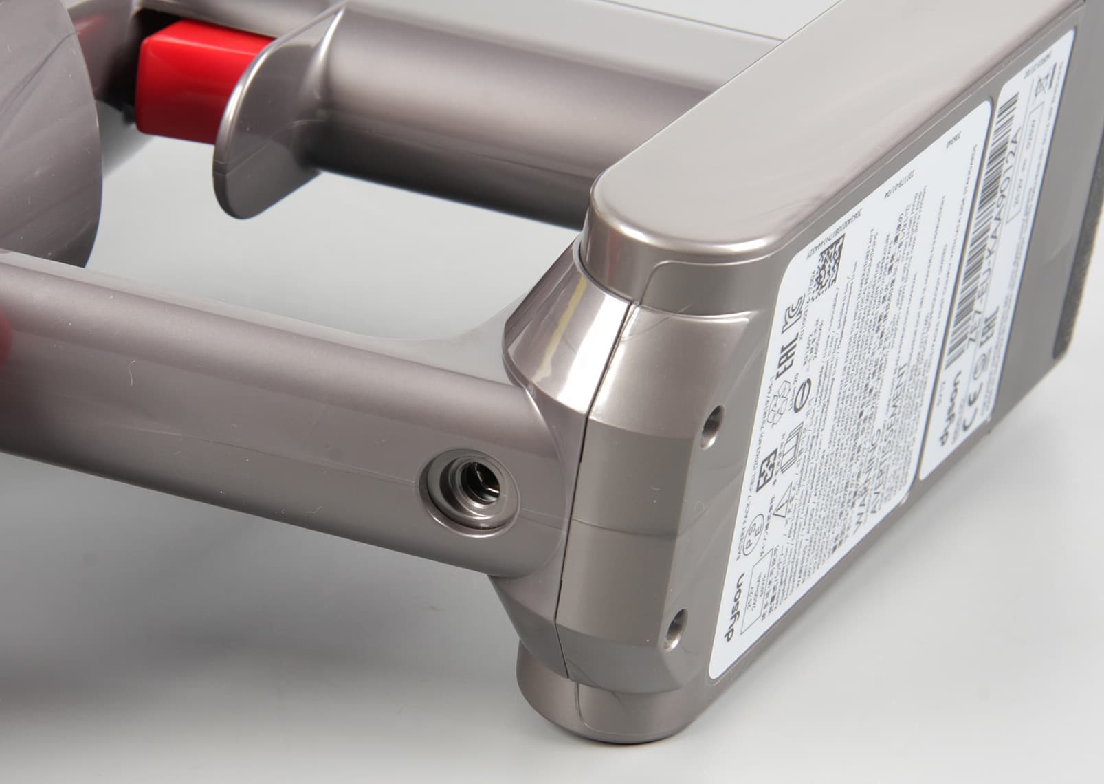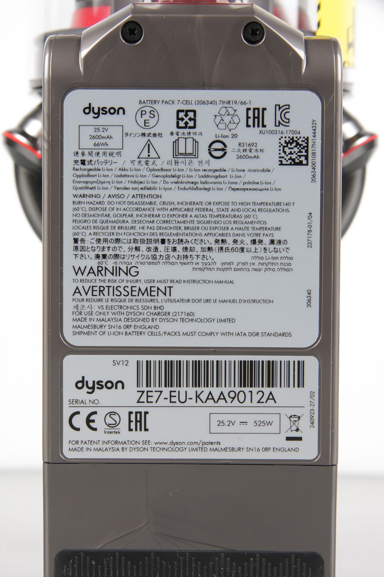 Ёмкость батареи в сравнении с V8 увеличена всего на 1 Вт·ч, однако в ней 7 элементов и выше напряжение. Более высокое напряжение может увеличить эффективность и удельную мощность мотора. Видимо, в батарее V10 снова используются элементы типа 18650, а не 21700, как в V8. Отметим, что на сам пылесос и даже на аккумуляторную батарею установлена гарантия в два года. При необходимости аккумулятор может заменить сам пользователь (инструкция по замене прилагается к новой батарее), для чего достаточно отвернуть три самореза.