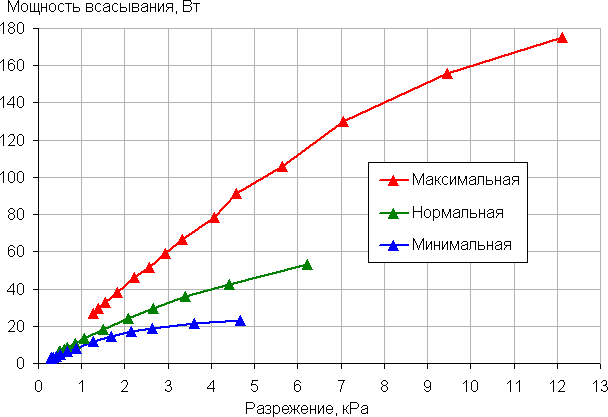 Мощность всасывания (что это такое и как мы ее измеряем, описано в отдельной статье) мы определяли при работе пылесоса на трех уровнях мощности без трубы и насадок. Зависимости мощности всасывания от создаваемого разрежения приведены на графике ниже:
