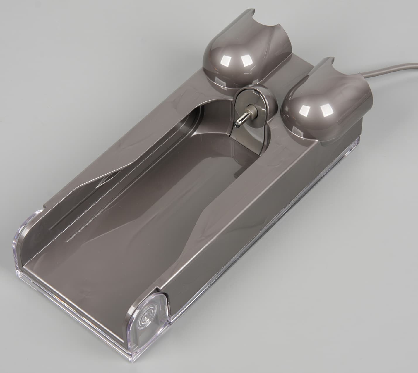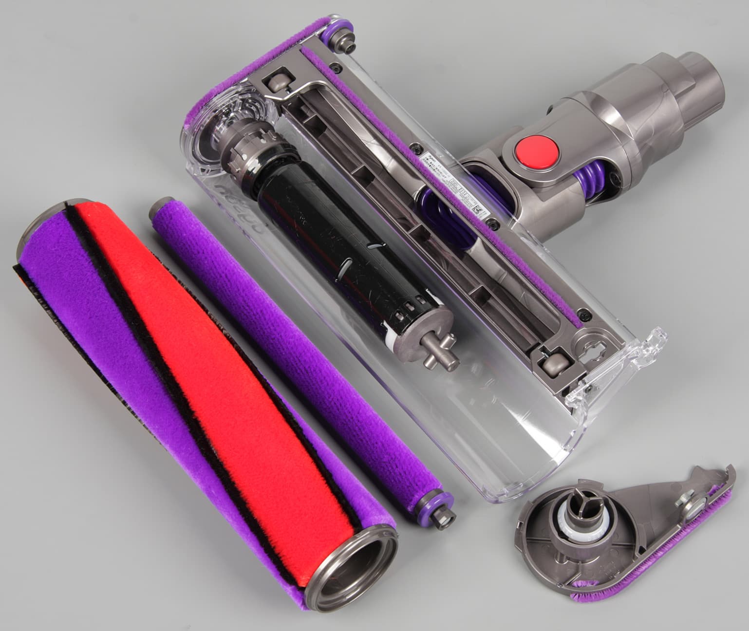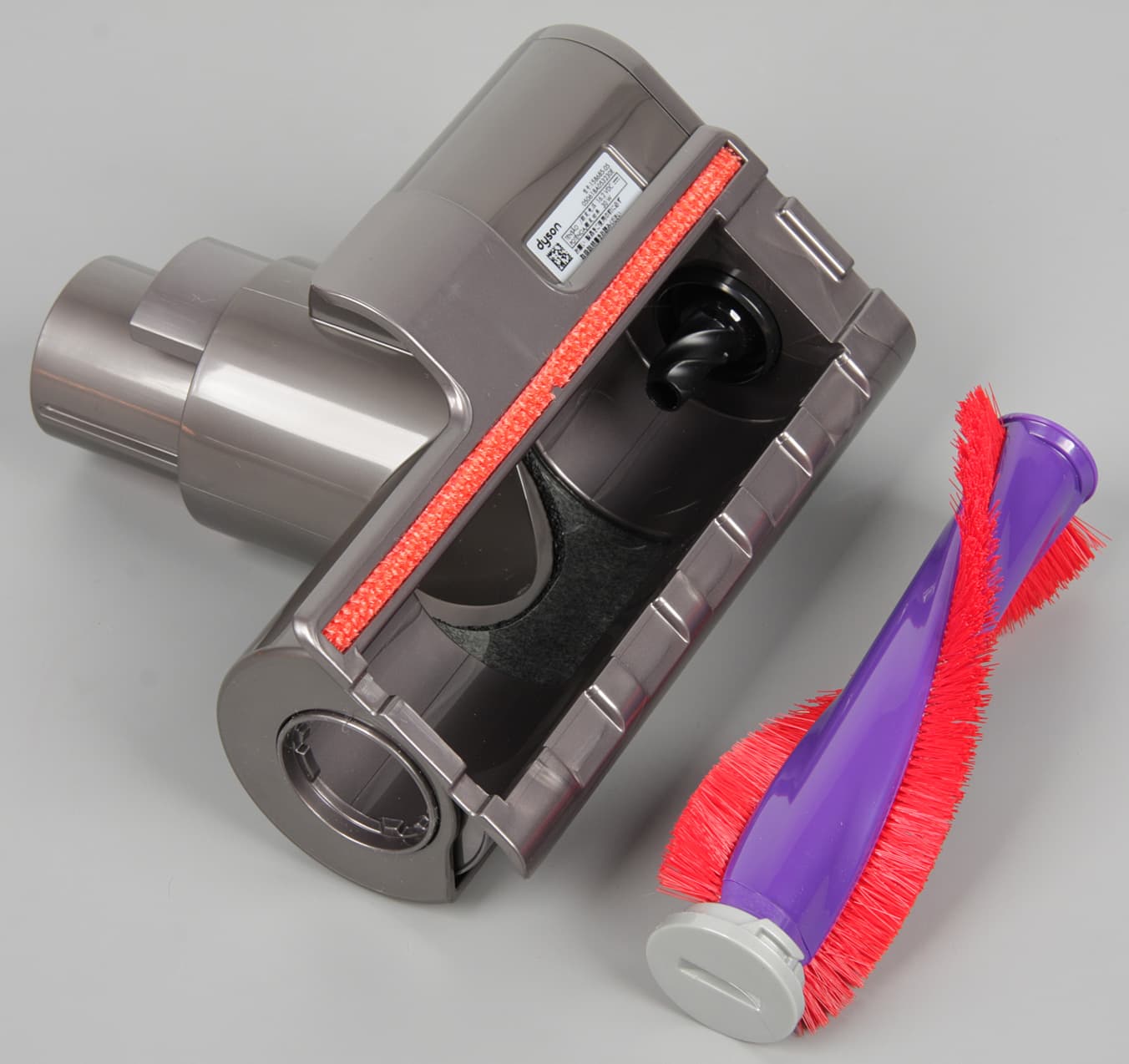 Эту щетку можно подсовывать под протяженные предметы обстановки с небольшим (от 70 мм) просветом. Активно воздействовать на очищаемую поверхность призвана вращающаяся от электромотора щетка с двумя спиральными рядами щетинок. При этом черный ряд сформирован из мягких щетинок из углеродного волокна, хорошо сохраняющего форму, а красный — из нейлоновых щетинок потолще и более жестких. На холостом ходу скорость вращения щетки составляет 3800 об/мин.