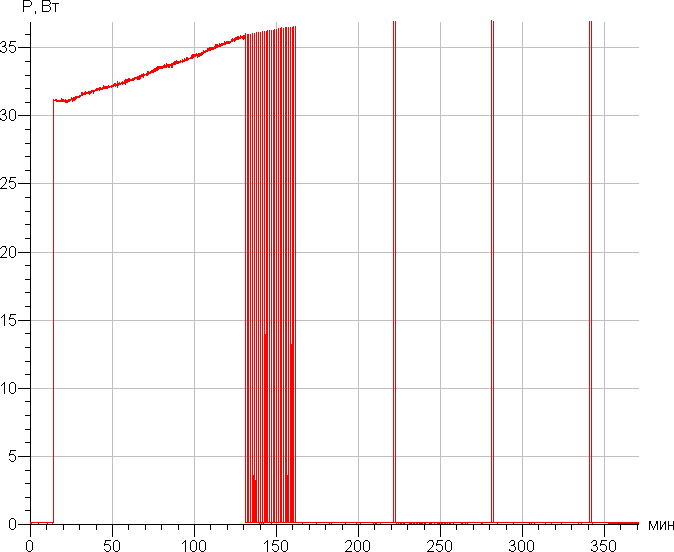 На полную зарядку потребовалось 2 часа 40 минут после непрерывной работы на максимальной мощности и 3 часа после работы на средней мощности. График заряда для первого случая приведен ниже (указано потребление от сети):