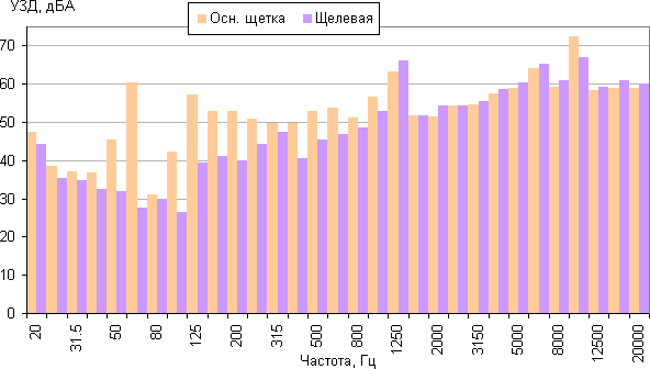 Приведем уровень звукового давления (УЗД) в диапазоне 20—20000 Гц в полосах по ⅓ октавы в режиме с нормальной мощностью с электрощеткой и щелевой насадкой: