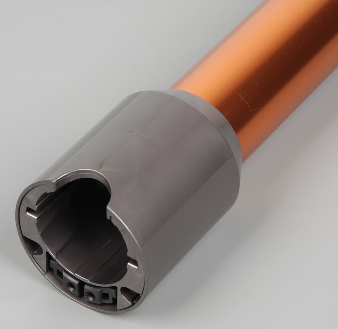 Внутрь трубы вставлен вкладыш из пластика, образующий гладкий и ровный канал для прохода воздуха. На торцах трубы можно разглядеть разъемы, обеспечивающие подключение электрических приводов щеток к источнику питания.