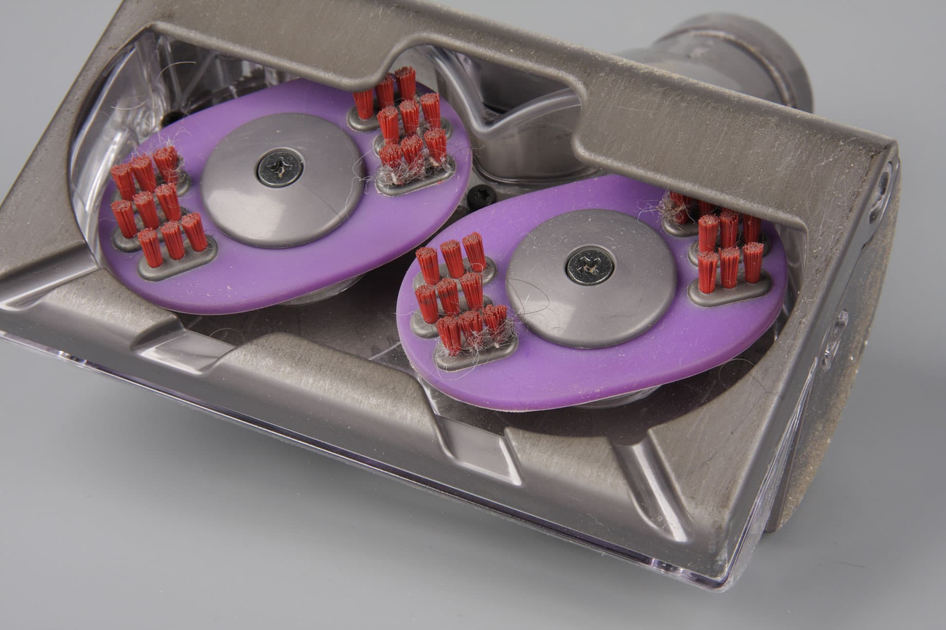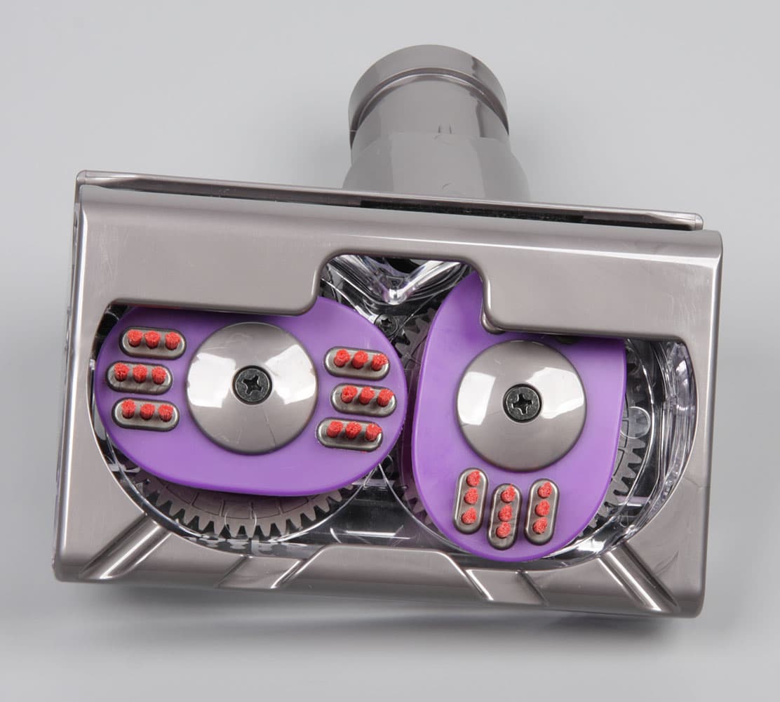 Насадка оснащена двумя встречно вращающимися щетками, оси которых ориентированы перпендикулярно полу. На упругих овальных пластинах щеток закреплены пучки нейлоновых щетинок. Отсутствие валика по замыслу разработчиков исключает наматывание волос и шерсти.