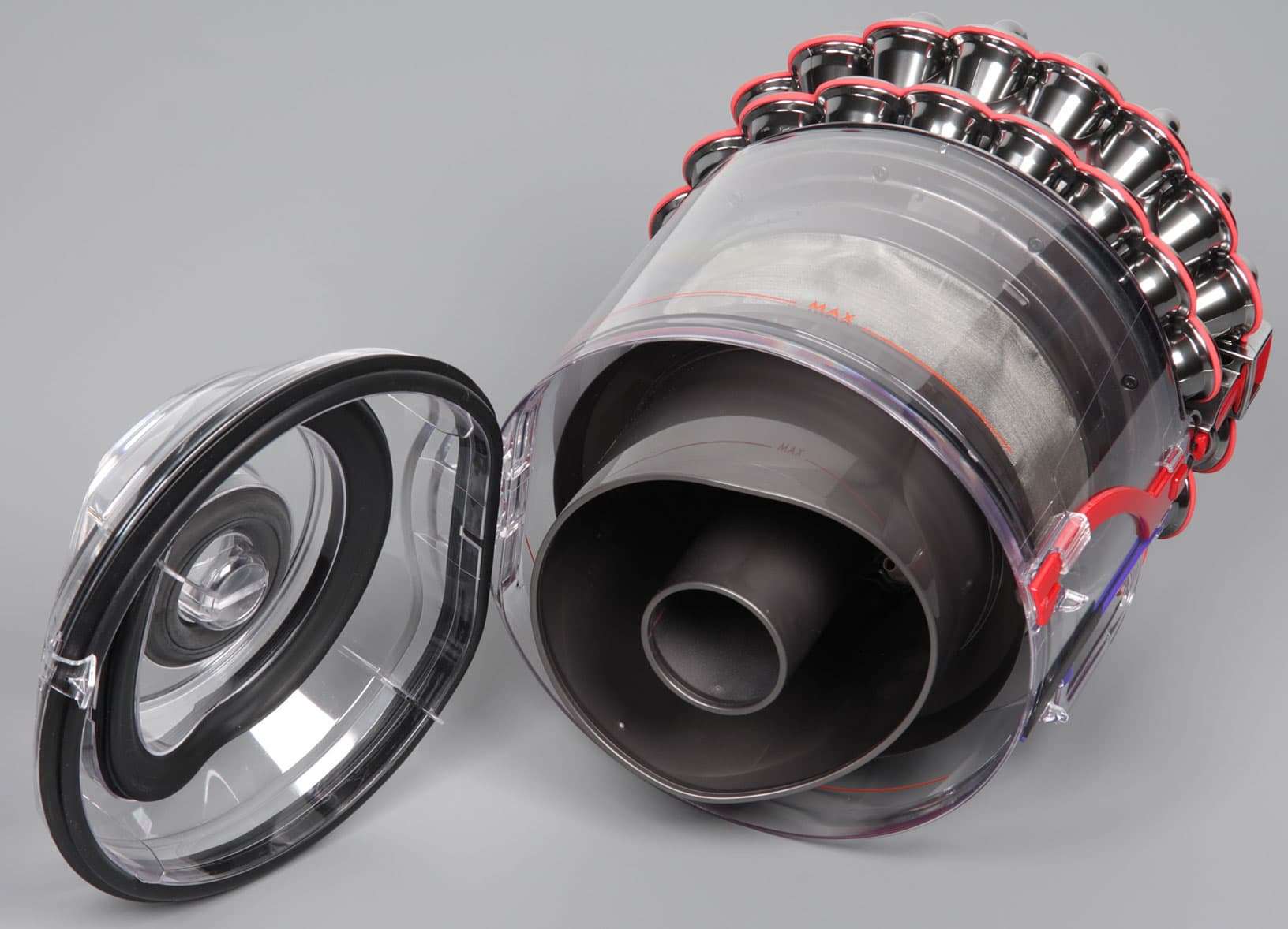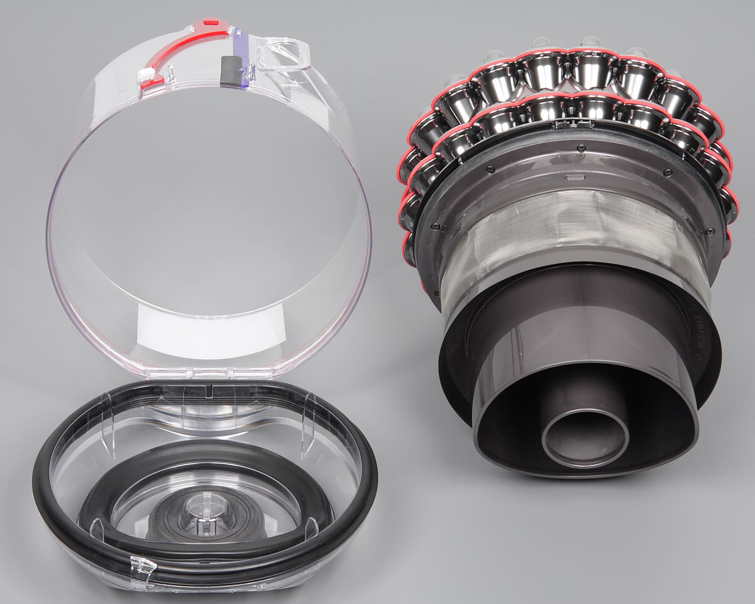 Мусор с сетки счищается щеткой или комплектным резиновым скребком с фиолетовой ручкой, закрепленным на внешней стенке стакана. В отличие от блока циклона, сам стакан можно мыть под водой. Система фильтрации трехступенчатая. Цилиндрический корпус пылесборника формирует большой циклон первой ступени, на которой отделяется большой и тяжелый мусор, легкий и крупный мусор, типа волокон и шерсти задерживается сеткой из нержавеющей стали с ячейками в 240 мкм. Финальную очистку воздуха выполняют множество мелких циклонов, которые сепарируют мельчайшую пыль и воздух, пыль сваливается в контейнер пылесборника, а воздух идет по верхнему патрубку к вентилятору. Гибкие кончики циклонов вибрируют в потоке воздуха и стряхивают вниз налипшую пыль.