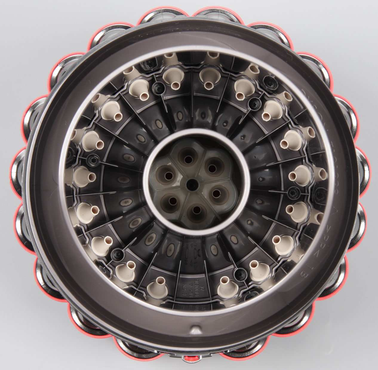 Комментарий представителей Dyson: В действительности, систему можно считать четырехступенчатой, так как массив маленьких циклонов разделен на две последовательные ступени очистки. Первая ступень — 18 циклонов в один ряд; вторая ступень — три ряда по 6, 12 и 18 циклонов. Соответственно, всего 54 маленьких циклонов и один основной большой.