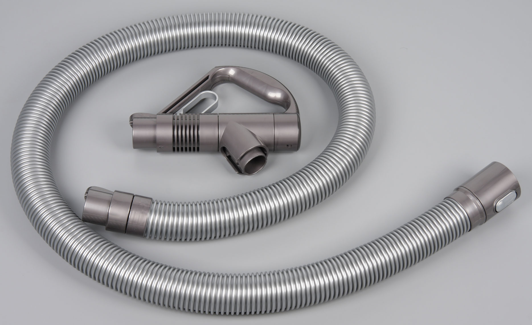 Выходит воздух через решетку внизу сзади, за которой можно разглядеть что-то складчатое. Возможно, это постмоторный фильтр, не сменный, и рассчитанный на весь срок эксплуатации. Отметим, что все стыки отделяемых элементов конструкции, трубы и насадок, по которым проходит воздух от очищаемой поверхности до вентилятора, имеют уплотнения из резины или упругого пластика, поэтому паразитный подсос воздуха пренебрежимо мал. Надежное соединение патрубка с трубой/насадками и трубы с насадками обеспечивается фиксаторами-защелками. Гибкий патрубок легкий. Рукоятка от него отсоединяется, что удобно при устранении засоров. Патрубок вращается в сочленениях, дополнительно ввод рукоятки вращается относительно стыка с трубой где-то на 90°. Такая подвижность обеспечивает легкость манипуляций с насадками и снижает вероятность перекручивания и пережимания патрубка. Длина патрубка с рукояткой в сборе составляется примерно 180 см.
