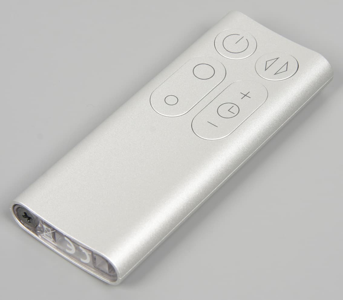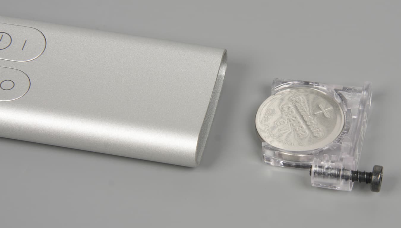 Пульт небольшой и легкий (20 г, 78×32,5×10 мм), его корпус и кнопки изготовлены из пластика с матовым серебристым покрытием, а в торцах — заглушки из прозрачного пластика, тонированного в случае передней. При нажатии кнопки негромко щелкают. Передача команд — по ИК. Работает пульт от одного элемента питания типа CR2032. Для его замены потребуется крестовая отвертка.