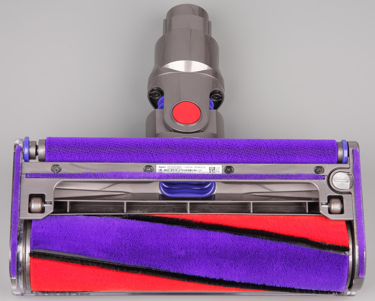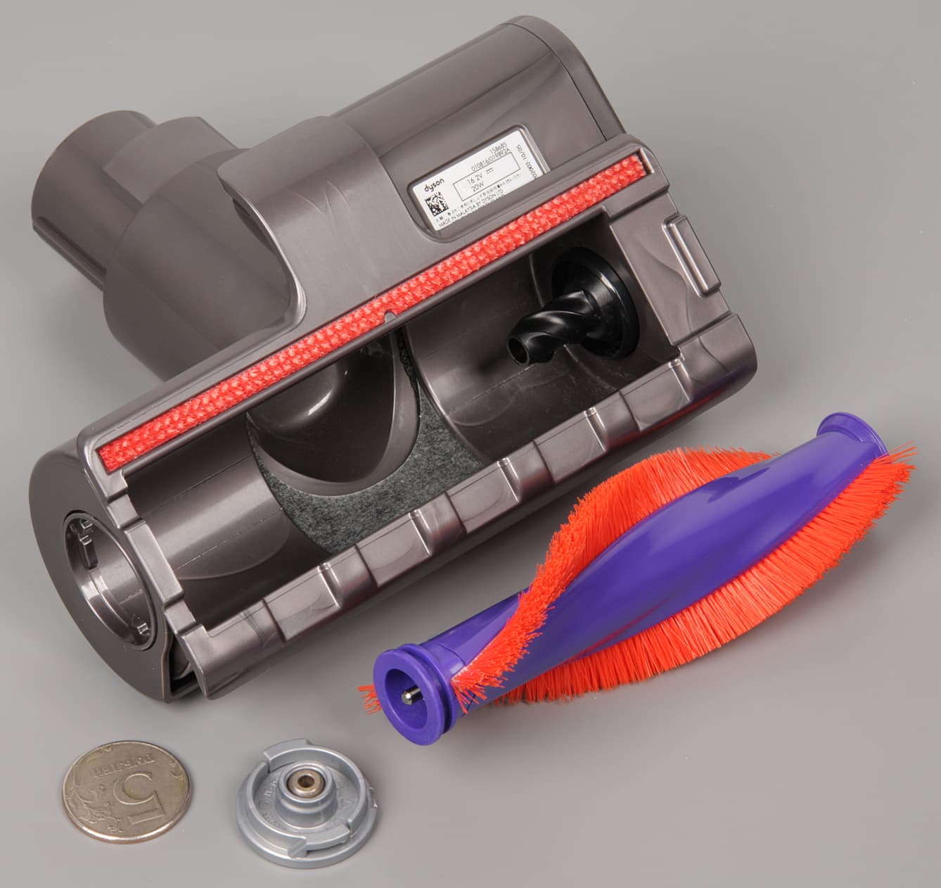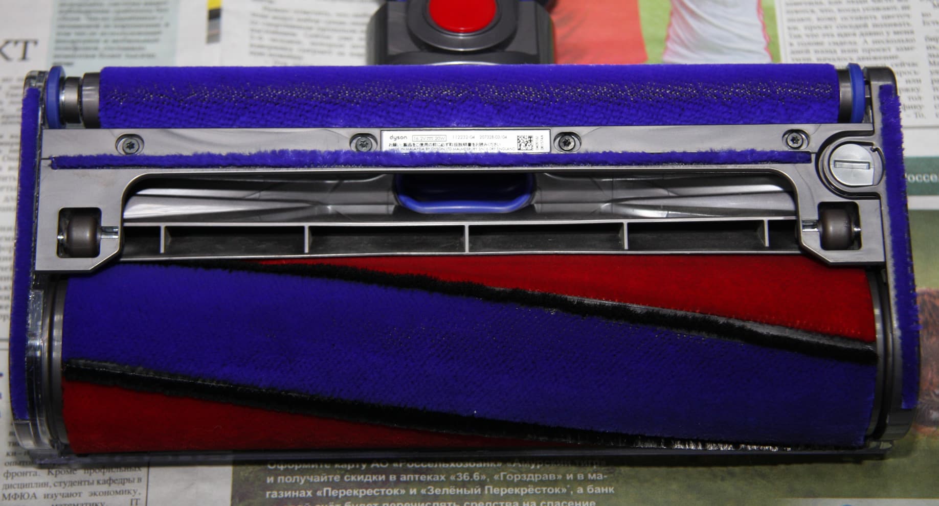 Эту щетку можно подсовывать под протяженные предметы обстановки с небольшим (от 70 мм) просветом. Активно воздействовать на очищаемую поверхность призвана вращающаяся от электромотора щетка с двумя спиральными рядами щетинок. При этом черный ряд сформирован из мягких щетинок из углеродного волокна, хорошо сохраняющего форму, а красный — из нейлоновых щетинок потолще и более жестких. При работе прозрачный колпак позволяет определить, вращается ли щетка (она останавливается, при повышенном сопротивлении вращению), а в перерывах видно, сколько и чего на щетку намоталось и не пора ли ее почистить. Для извлечения щетки нужно монетой (в комплект поставки не входит) повернуть заглушку с торца.