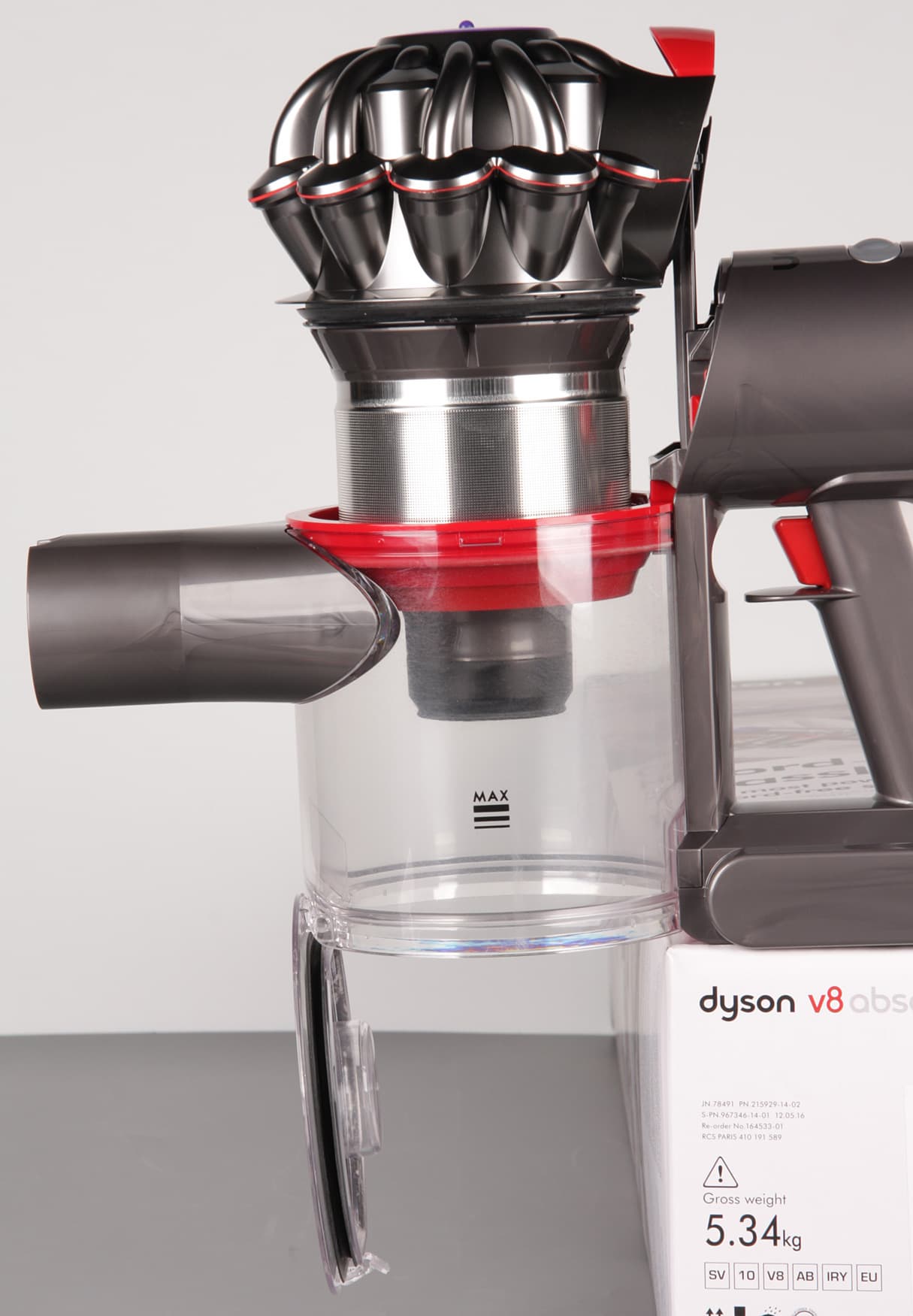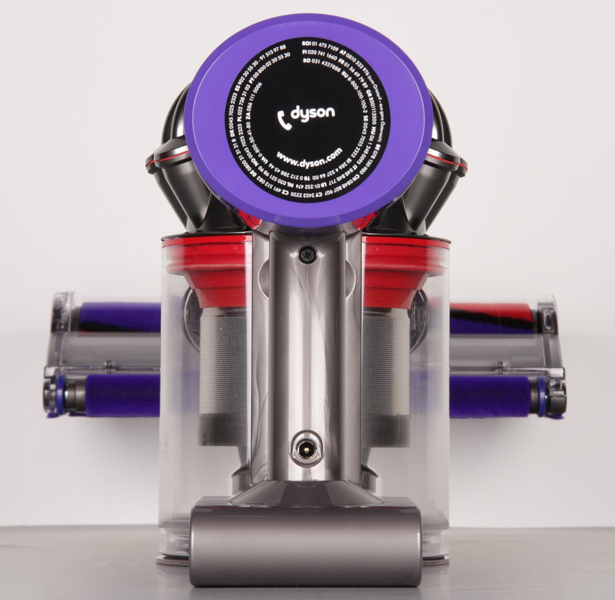 Пылесос Dyson V8 принципиально не отличается от рассмотренной ранее модели V6, однако в конструкцию самого пылесоса и насадок внесен ряд изменений, улучшающих потребительские свойства. Справа — Dyson V8, слева — Dyson V6, уже со слегка помутневшим после нескольких месяцев эксплуатации стаканом пылесборника: