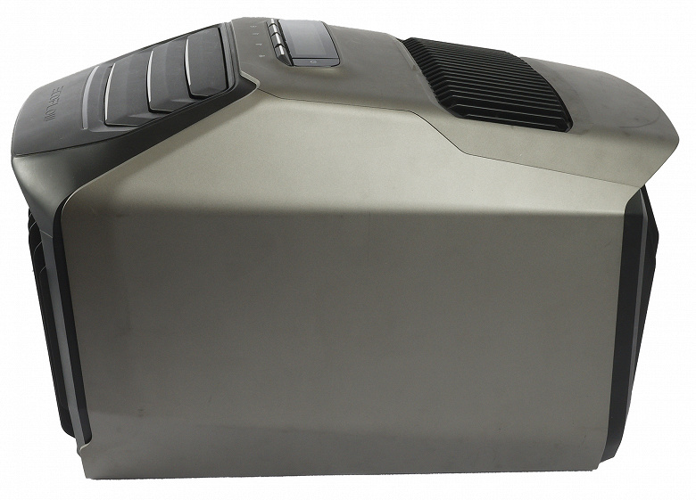 Пластиковый корпус оформлен в серебристо-черной гамме. Хотя главная особенность EcoFlow Wave 2 — мобильность, выраженных ручек для переноски у прибора нет: перемещать его приходится, удерживая за «козырьки» на переднем и заднем торцах. Напомним: вес 14,5 кг.