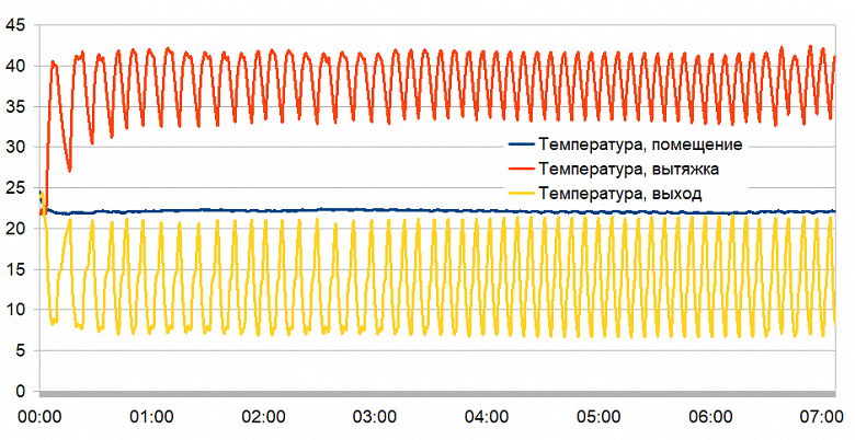 Температура на выходе из устройства в таком режиме колеблется между 7 °C и 21 °C, оставаясь при этом чуть ниже комнатной. Температура в вытяжной трубе изменяется в пределах от 33 °C до 42 °C.