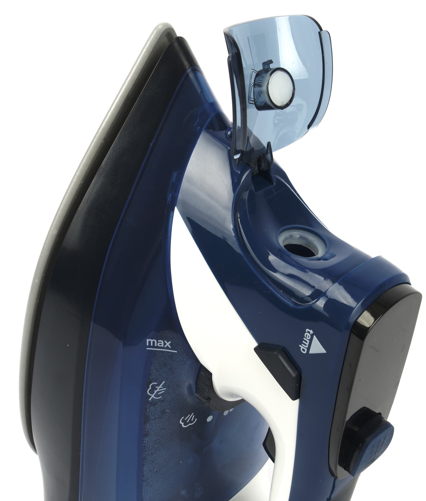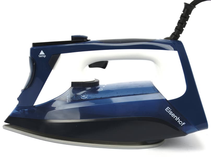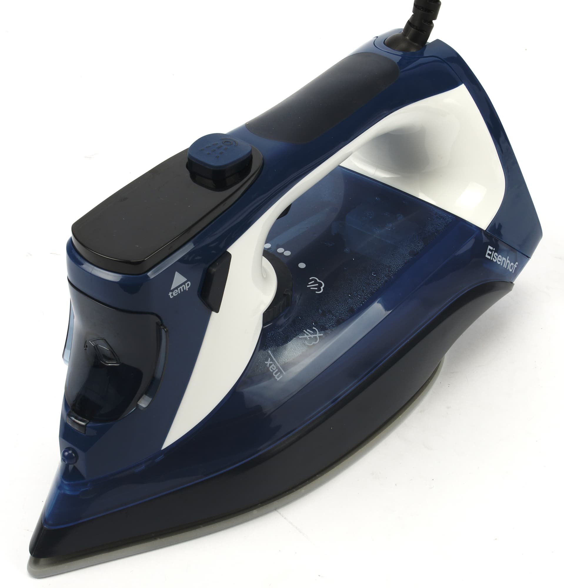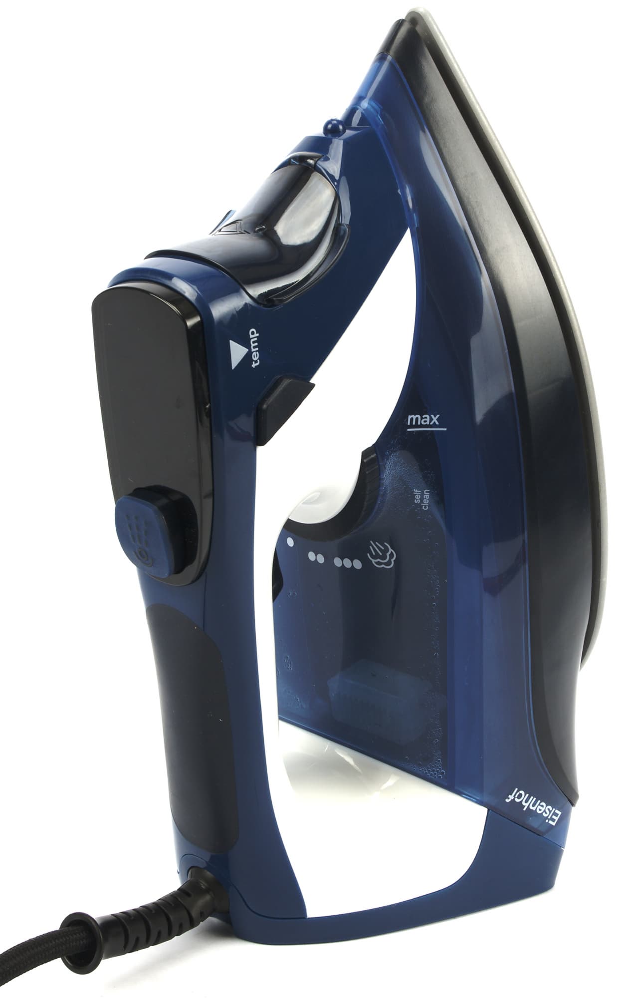 Утюг Eisenhof FS300 выглядит основательно за счет широкой выступающей вперед ручки с дисплеем. В остальном конструкция утюга стандартная и вопросов не вызывает. Пластиковый корпус выполнен в сочетании синего, черного и белого цветов.