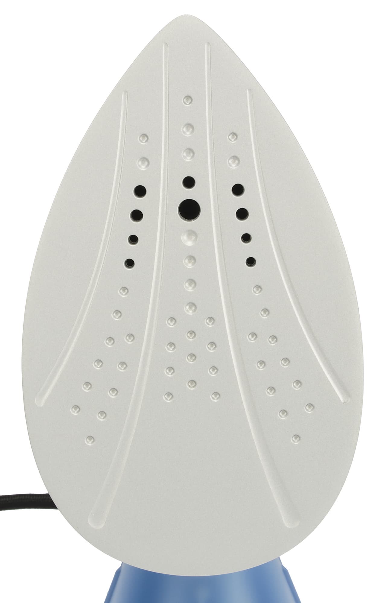 Рабочая поверхность в виде утюжка каплевидной формы имеет антипригарное покрытие. На подошве мы видим несколько продольных углублений и набор отверстий для выхода пара.