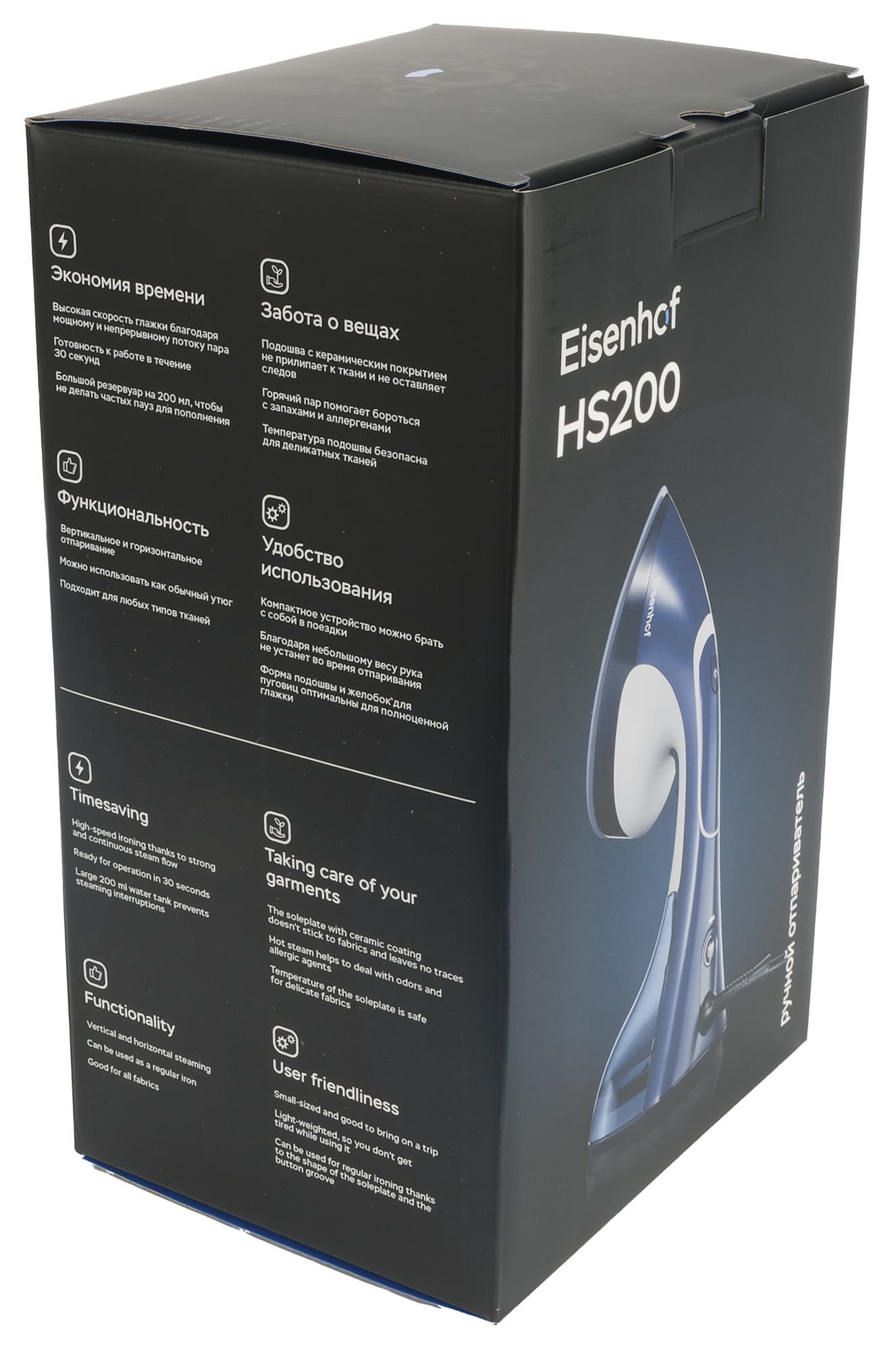 Отпариватель Eisenhof HS200 поставляется сразу в двух коробках. Внешняя, выполненная из прочного бурого картона, содержит небольшое количество самой важной информации и схематическое изображение прибора. Вторая, «парадная», упаковка оформлена в фирменной стилистике бренда. На ее гранях размещены цветные фотографии прибора и более подробное описание технических характеристик и главных преимуществ отпаривателя, благодаря чему можно составить полное впечатление об устройстве еще до распаковки.