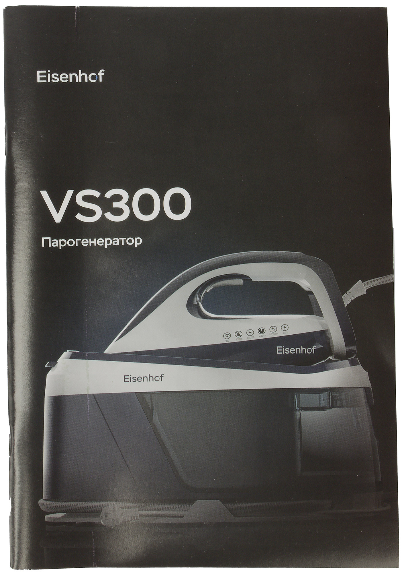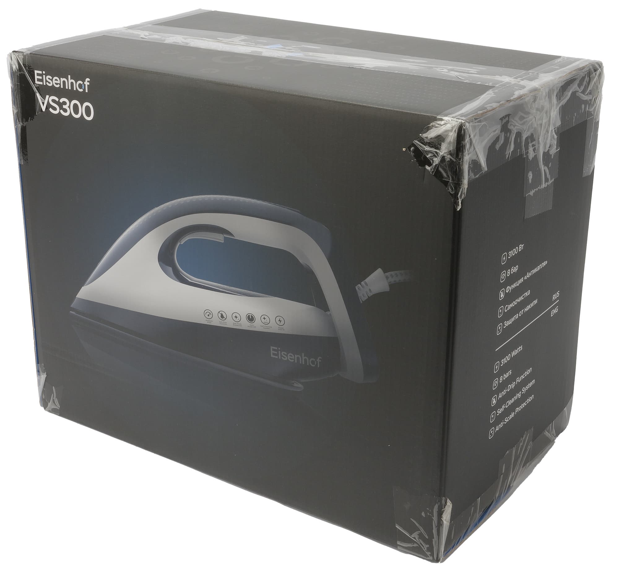 Парогенератор Eisenhof VS300 поставляется в двух коробках. Внешняя транспортировочная упаковка изготовлена из неокрашенного гофрированного картона, на ней размещено минимальное количество информации: название бренда, номер модели, графическое изображение парогенератора, а также габариты и вес устройства. Внутри находится более привычная для пользователя коробка с цветной качественной полиграфией, оформленная в фирменном стиле бренда.