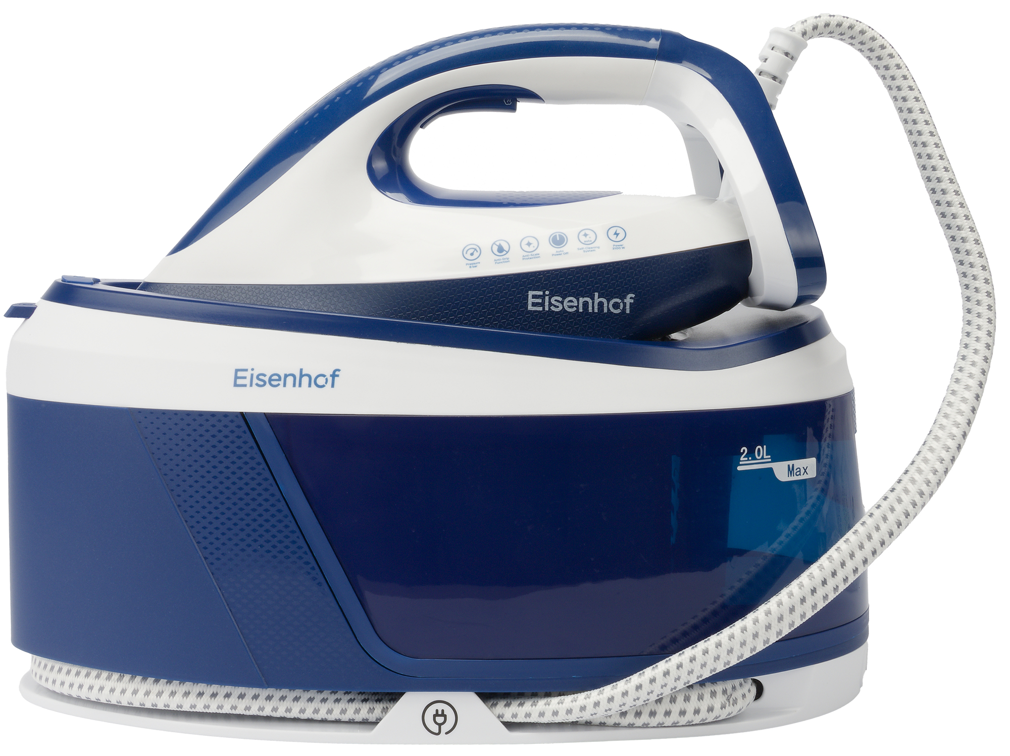 Парогенератор Eisenhof VS300 представляет собой единую конструкцию, состоящую из паровой станции с утюгом, соединенных между собой шлангом подачи пара.