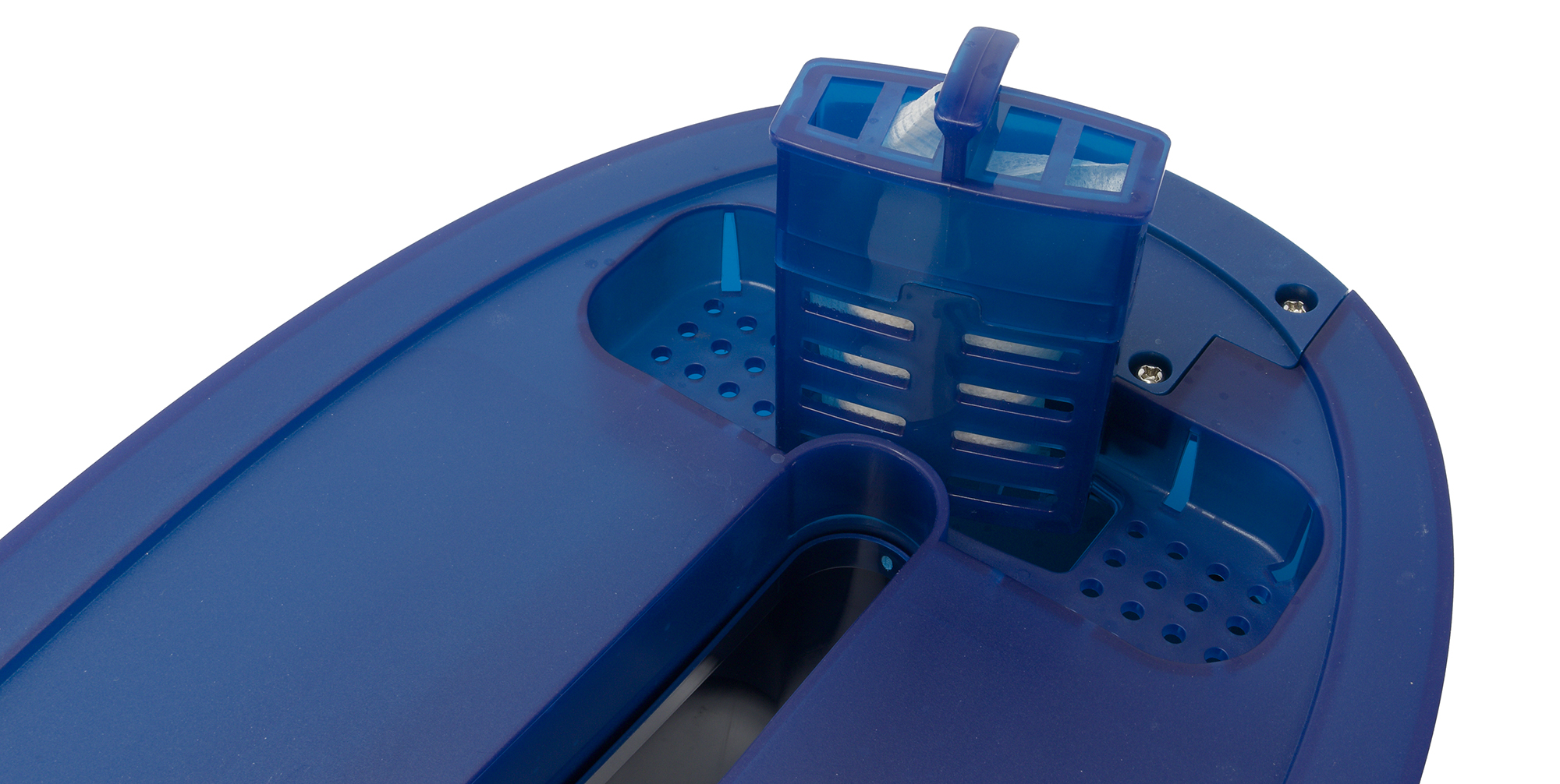 Двухлитровый съемный резервуар из затемненного пластика занимает больше половины базы. Емкость выдвигается с тыльной стороны при помощи ручки-фиксатора с клавишей. Резервуар отсоединяется при нажатии и одновременном движении на себя. На лицевой стороне есть отметка максимального объема воды. В вечернее время при искусственном освещении рассмотреть уровень воды не получится, более-менее что-то разглядеть можно только днем на просвет.