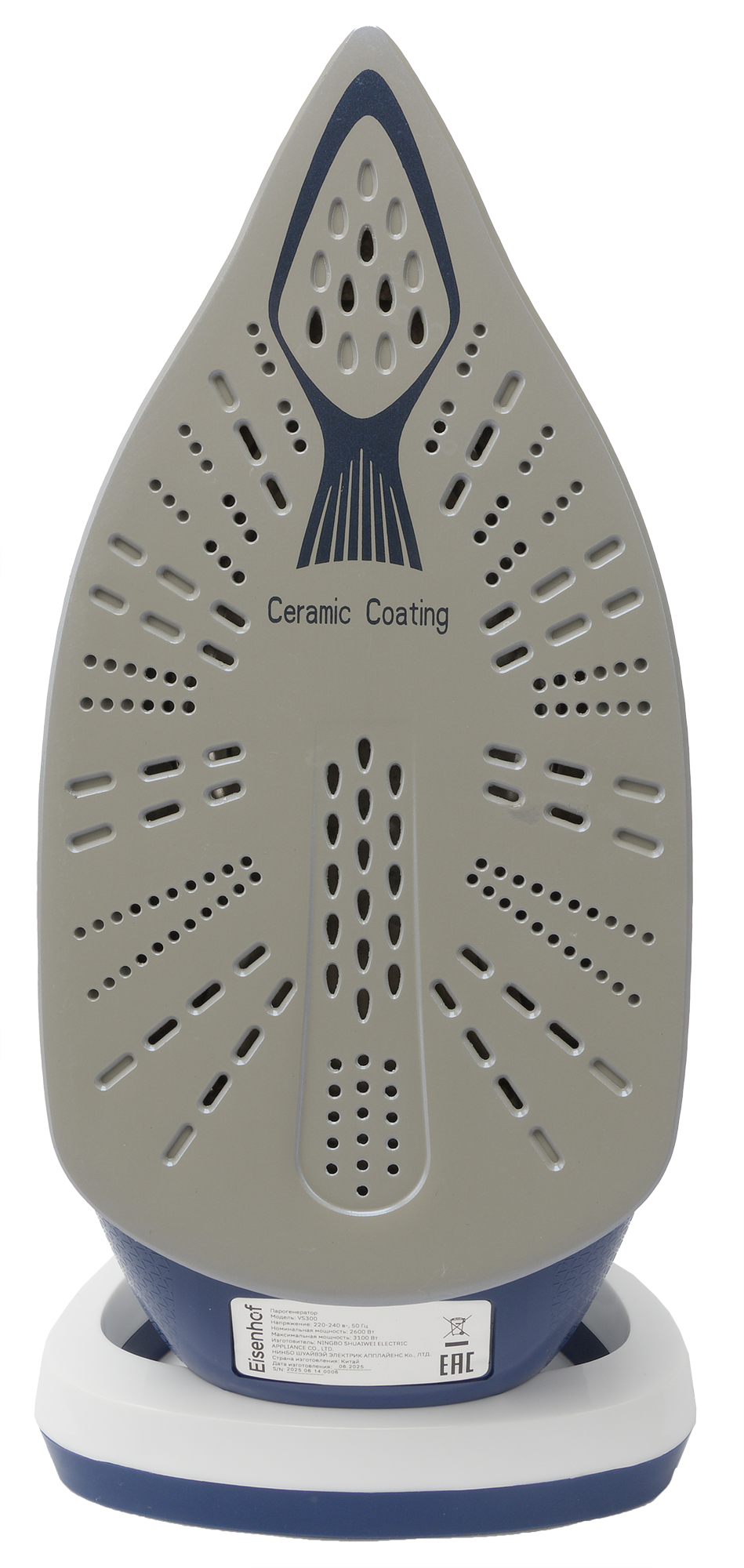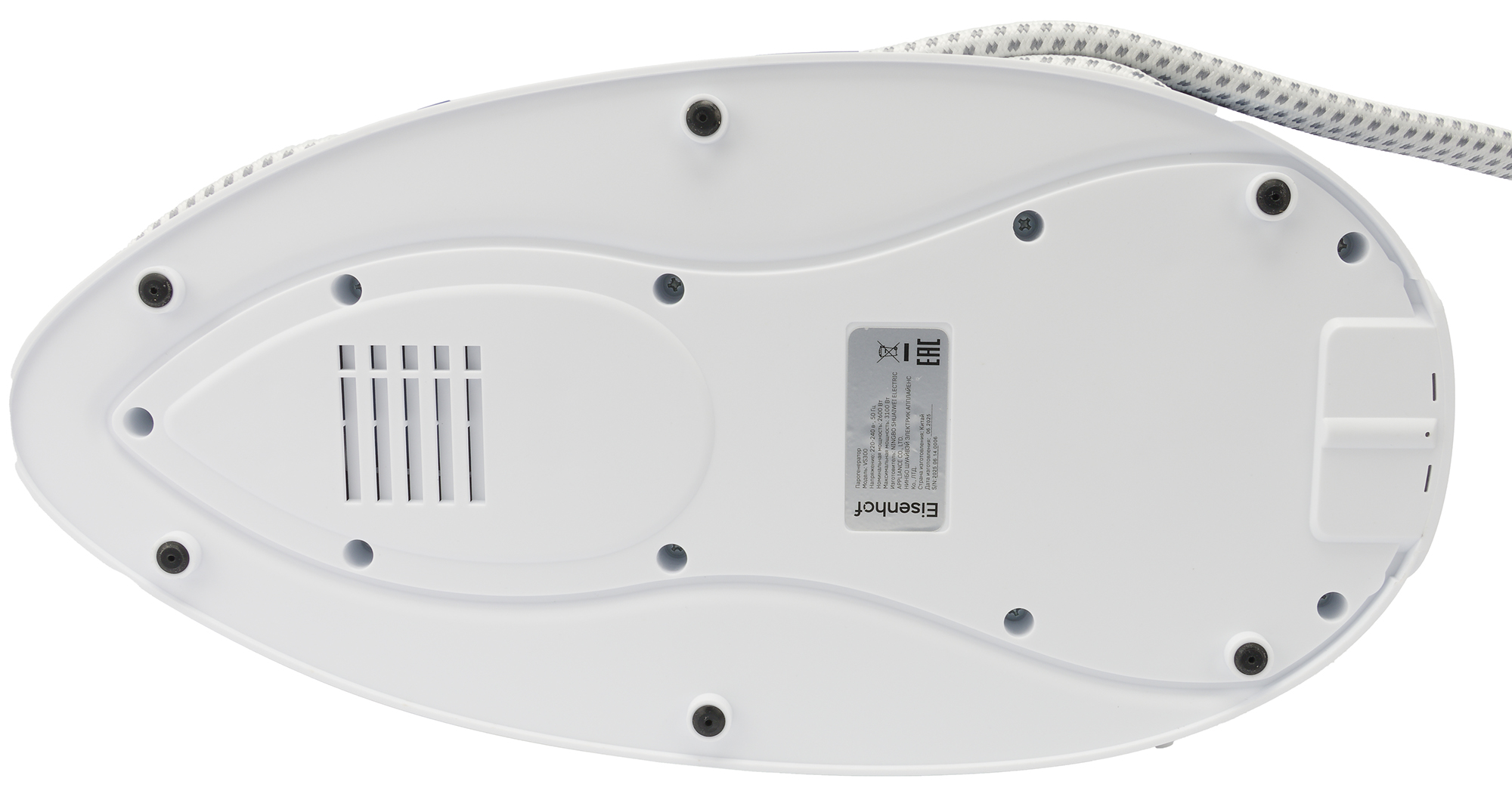 На дне парогенератора мы видим шесть резиновых ножек, наклейку с технической информацией и небольшое количество прорезей для вентиляции.