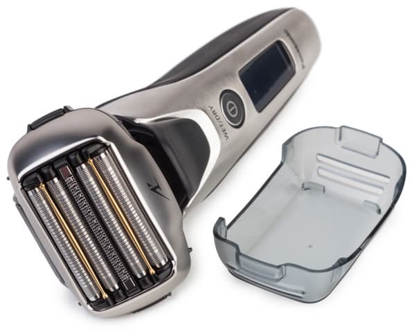 Судя по конструкции, Panasonic сделала ставку на экстенсивный путь развития: в то время как у Braun можно увидеть классическую схему «сетка/триммер/сетка», Panasonic уже в более ранних моделях использовала 4 ножа, а в ES-LV9N их число возросло до пяти: «сетка/сетка/триммер/сетка/сетка». Ну и, конечно, тут (как и у флагманов Braun) можно встретить упоминание некоего «датчика бритья», регулирующего мощность в зависимости от нагрузки на бритву (то есть от густоты волосяного покрова). Бреющая головка ES-LV9N в результате всех перечисленных нововведений выглядит довольно массивно и даже несколько пугающе.