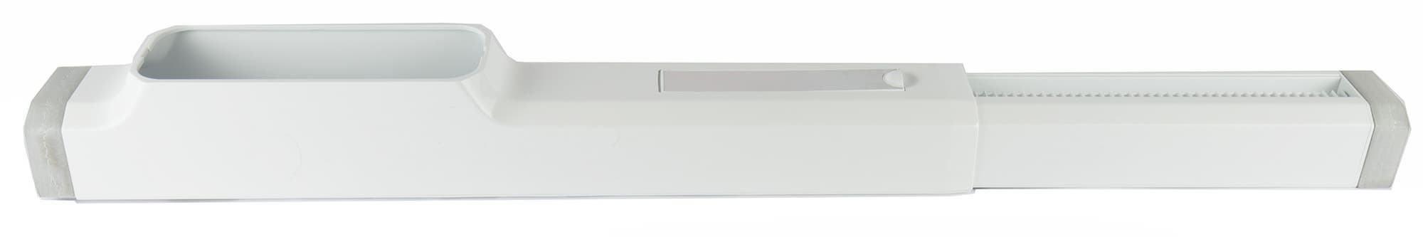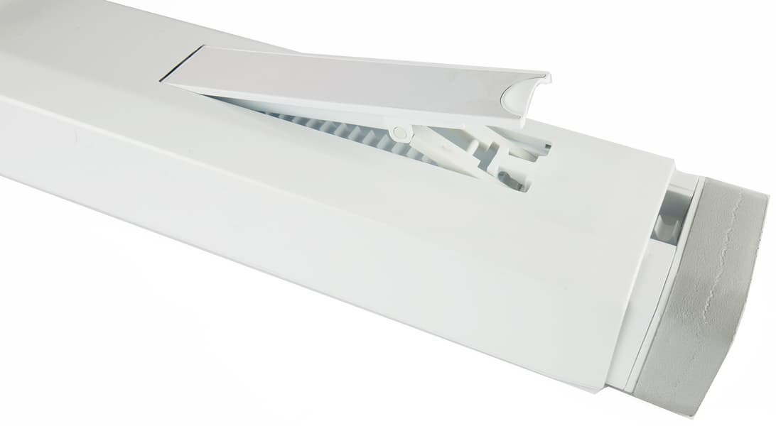 Прямоугольное отверстие на другом конце теплоотвода закрепляется в слайдере, который надо установить в оконном проеме. Раздвижное устройство позволяет закрепить его в окнах размером от 56 до 80 сантиметров. В комплекте есть также дополнительная секция, позволяющая увеличить общую длину слайдера до 112 см.