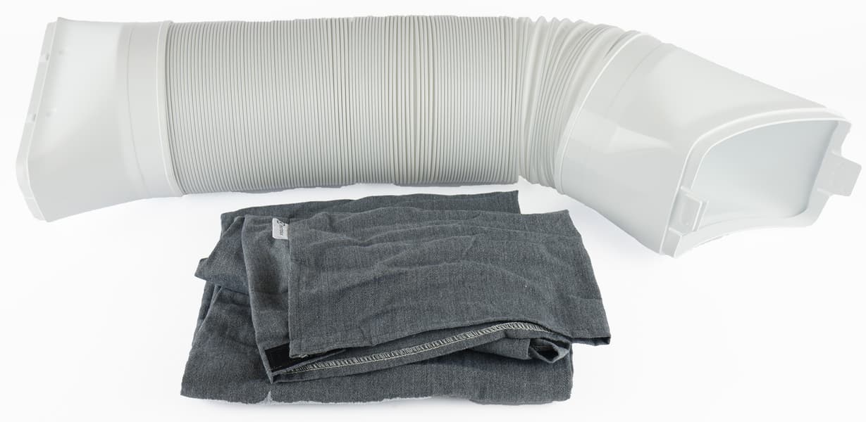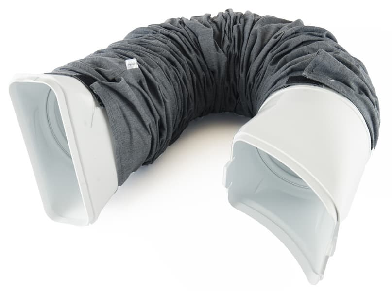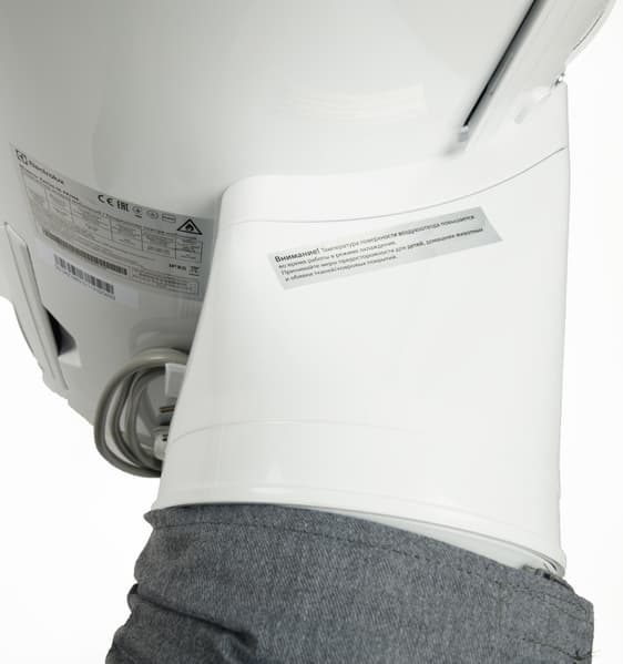 Рукав теплоотвода крепится к корпусу двумя защелками. Гофрированный хобот снабжен чехлом из хлопчатобумажной материи — он защищает отвод от повреждений и служит теплоизоляцией. Фиксируется чехол липучками-велкро и при необходимости легко снимается.