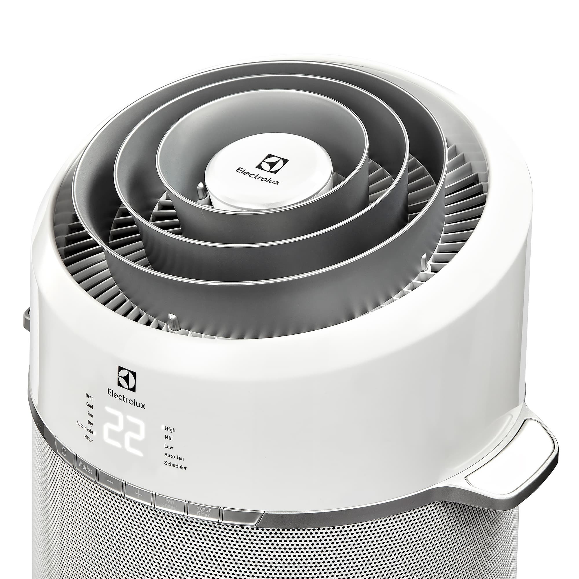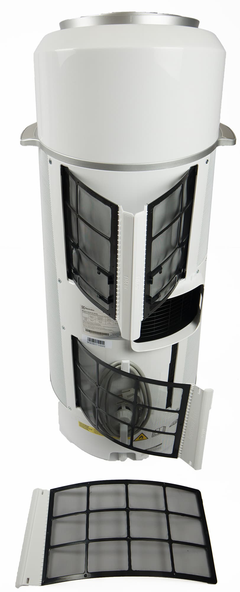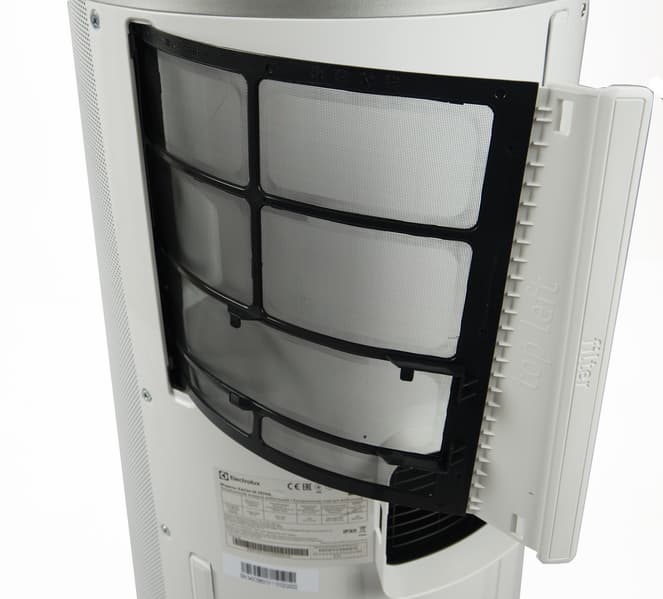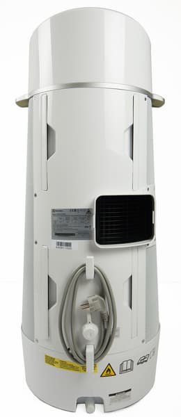 Корпус прибора цилиндрический. Большую часть его площади спереди и по бокам занимает впускная решетка. Охлажденный или нагретый воздух выходит из верхней решетки. Она снабжена тремя концентрическими кольцами, направляющими поток вверх под небольшим углом от вертикали. По бокам у кондиционера две пластиковые ручки, за которые его можно переносить.