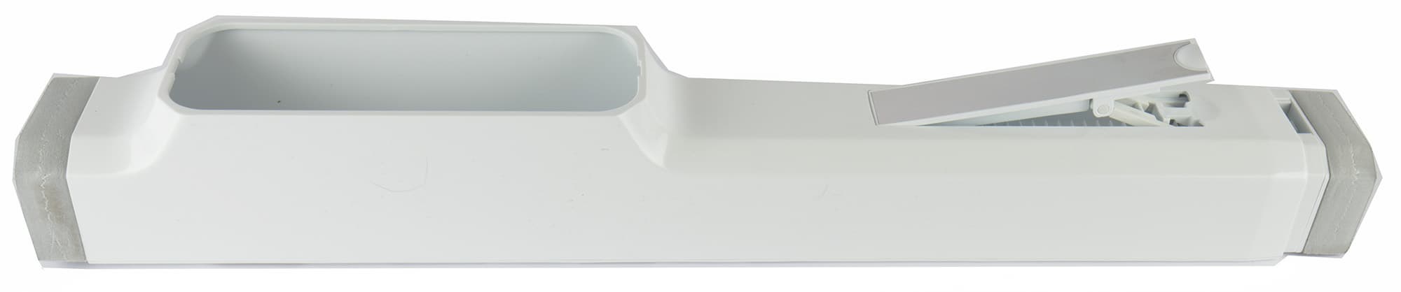В выбранном положении устройство фиксируется с помощью защелки. При нажатии на клавишу слайдер чуть удлиняется, что позволяет надежно распереть его в оконных проемах любой конструкции.