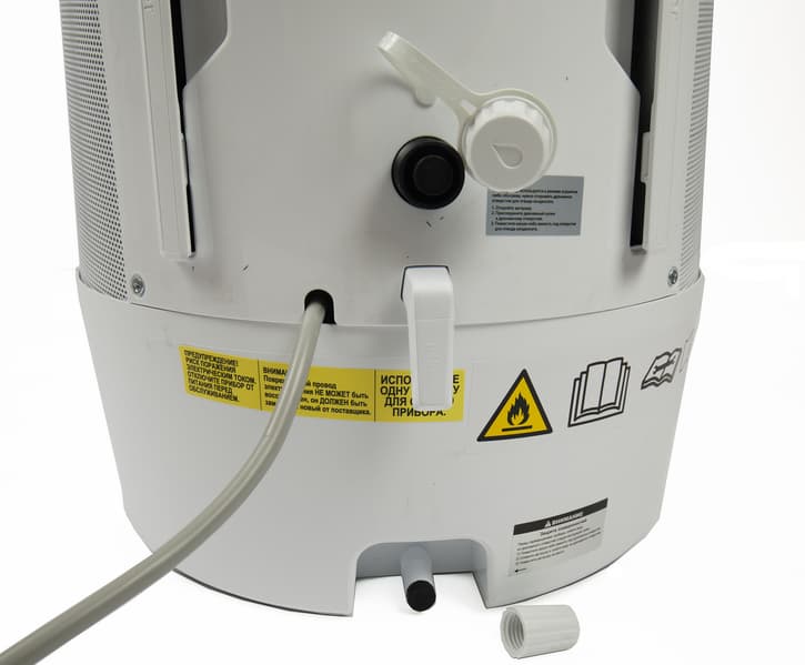 Еще одно дренажное отверстие расположено в нижней части прибора: оно предназначено для полного слива конденсата из внутренней емкости перед транспортировкой. Рядом также наклеен шильдик с инструкцией.