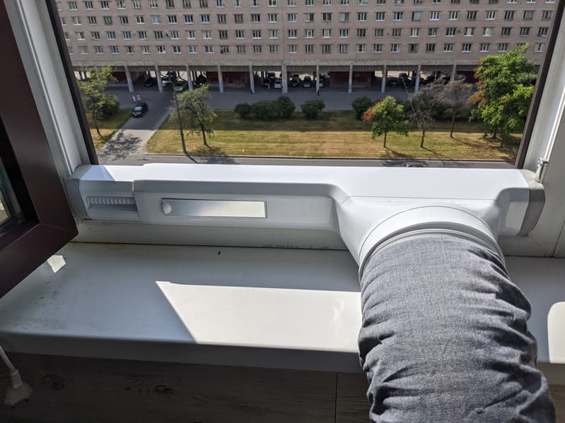 При поиске места для установки следует подумать и о размещении теплоотвода. Ставить кондиционер нужно как можно ближе к окну: так, чтобы расстояние до проема не превышало длины хобота. Полтора метра — максимальная длина, но лучше бы, по возможности, уменьшить ее, сложив до минимума гармошку теплоотвода: чем она длиннее, тем больше сопротивление воздуха в воздушном канале и, соответственно, ниже эффективность охлаждения.