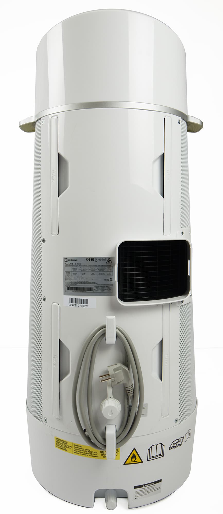 На задней стороне мы обнаружили разъем для подключения воздухоотвода, вкладки четырех воздушных фильтров, два дренажных отверстия и крюки для хранения электропровода.