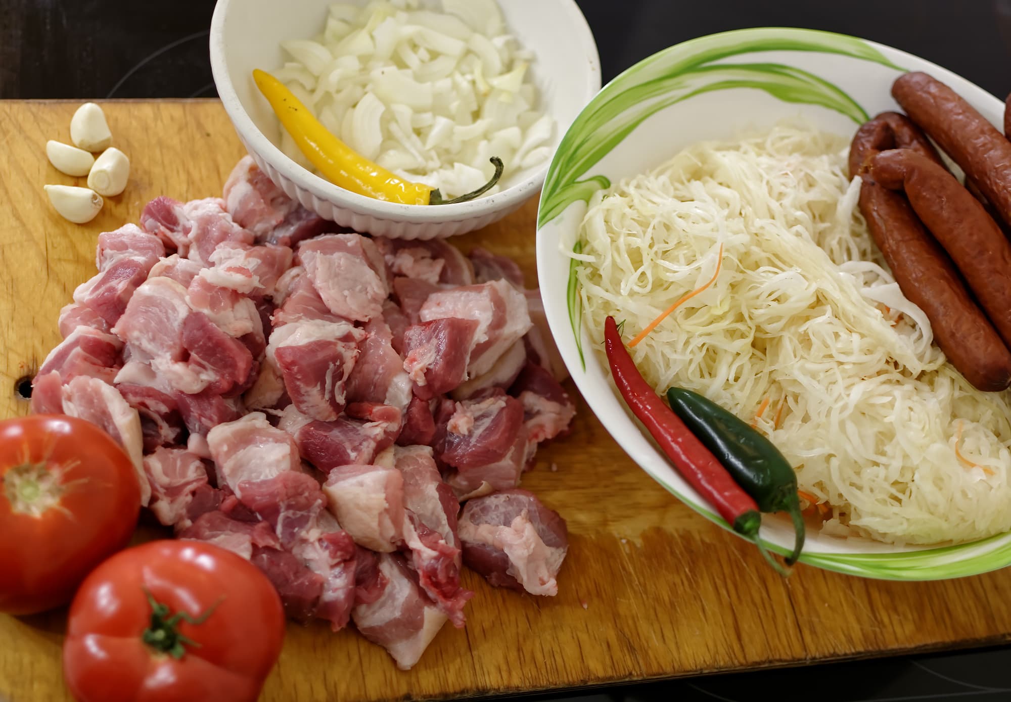 Мы раздобыли чугунную утятницу, а затем подготовили простейшие продукты: нарезали пару крупных луковиц, килограмм свиной грудинки, 400 г охотничьих колбасок, две хороших вкусных помидорины. Почистили несколько зубчиков чеснока, помыли несколько разноцветных перчиков разной остроты.