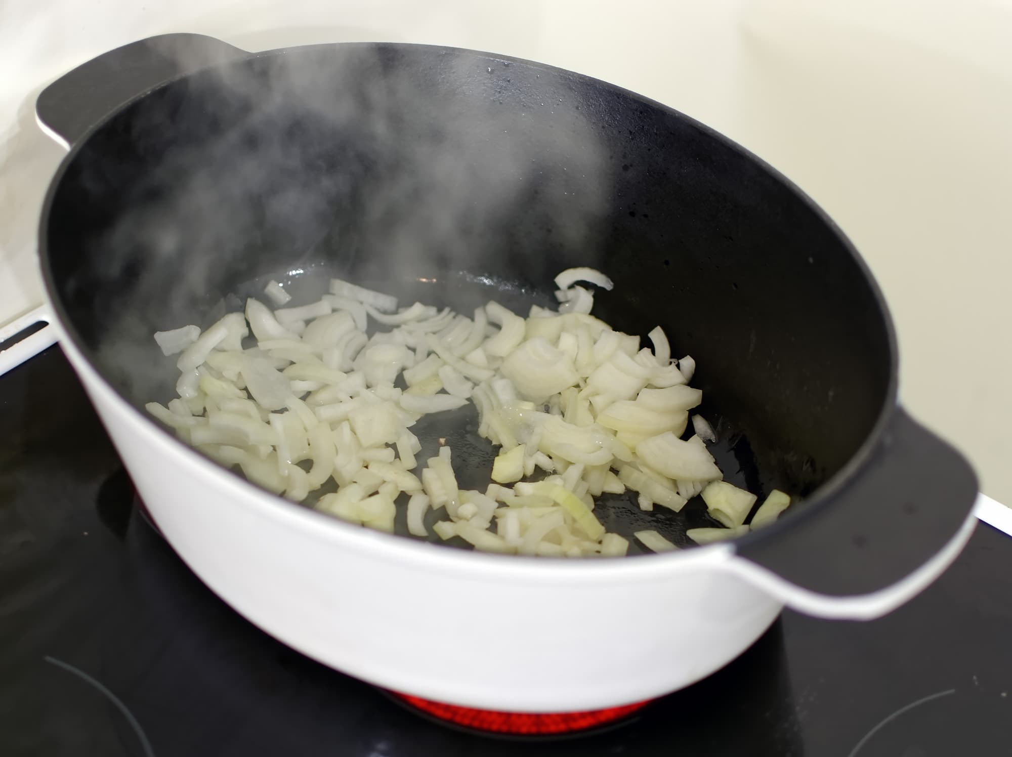 Раскалили на максимальном нагреве овальной конфорки нашу утятницу, налили туда немного масла и стали обжаривать лук.