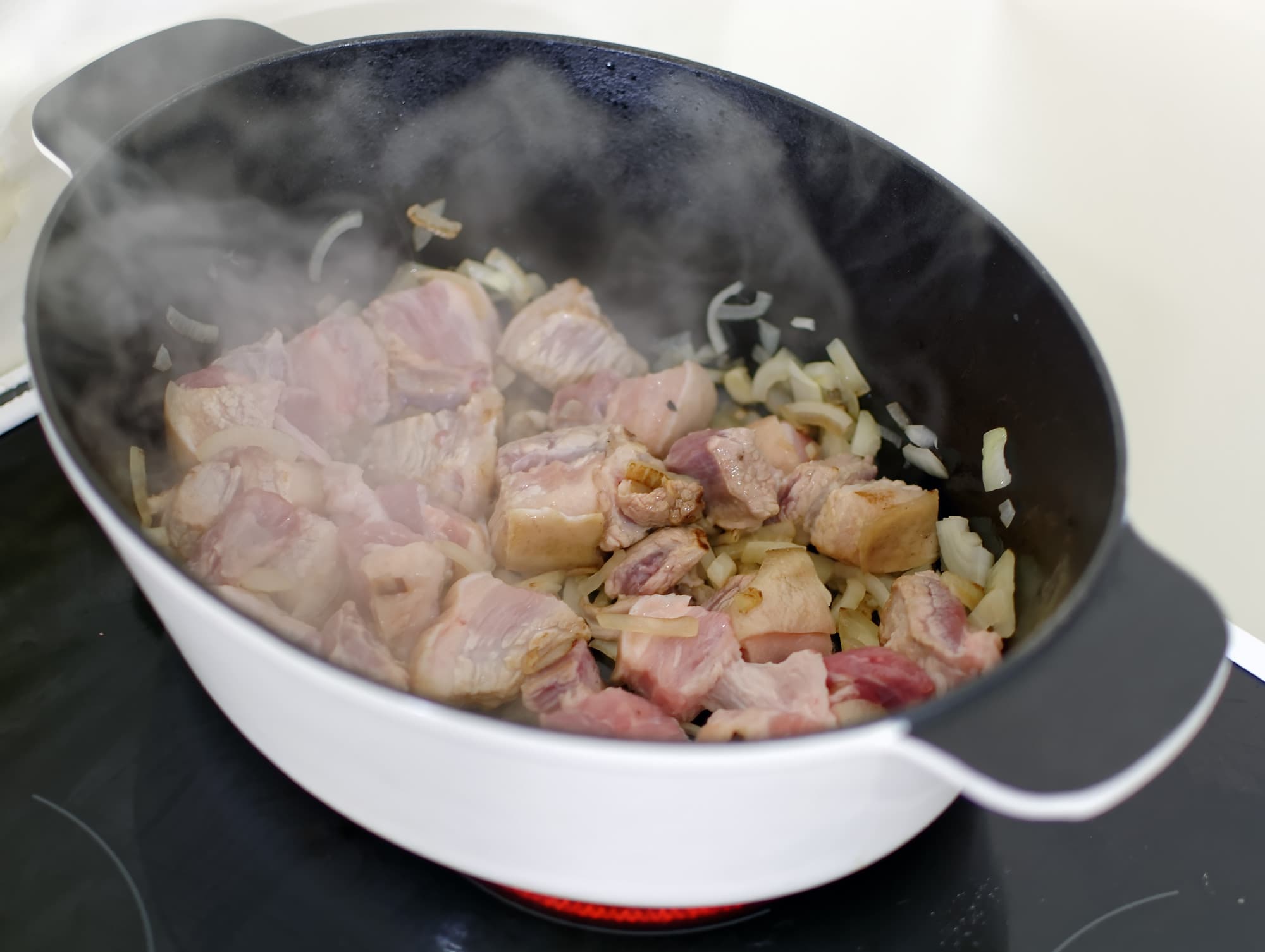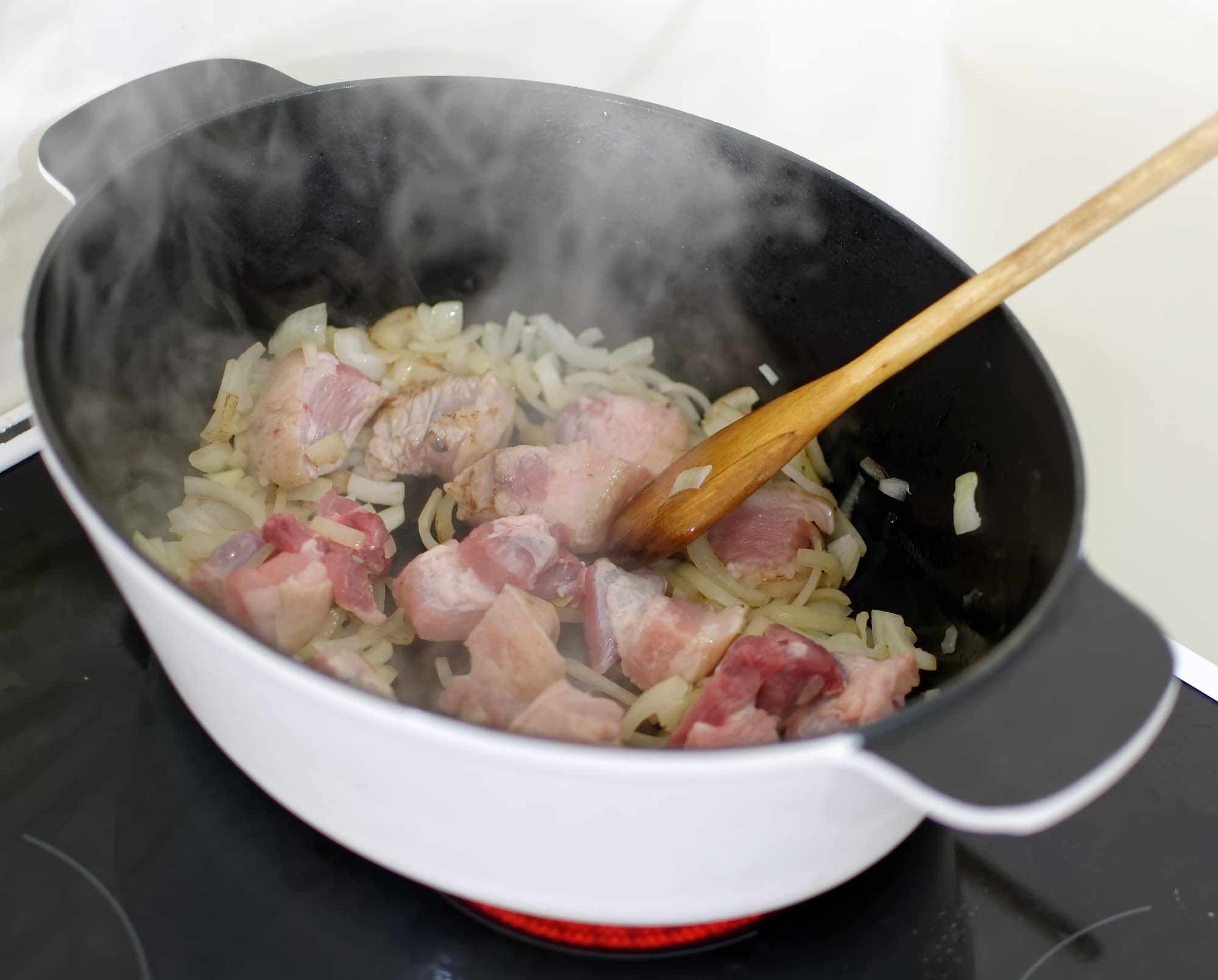 А затем — свиную грудинку, добавляя ее небольшими порциями. С таким нагревом, как мы выяснили по тому, как вело себя и с какой скоростью обжаривалось мясо, можно приготовить любое блюдо — мощности хватит. К равномерности обжарки также никаких претензий не оказалось.