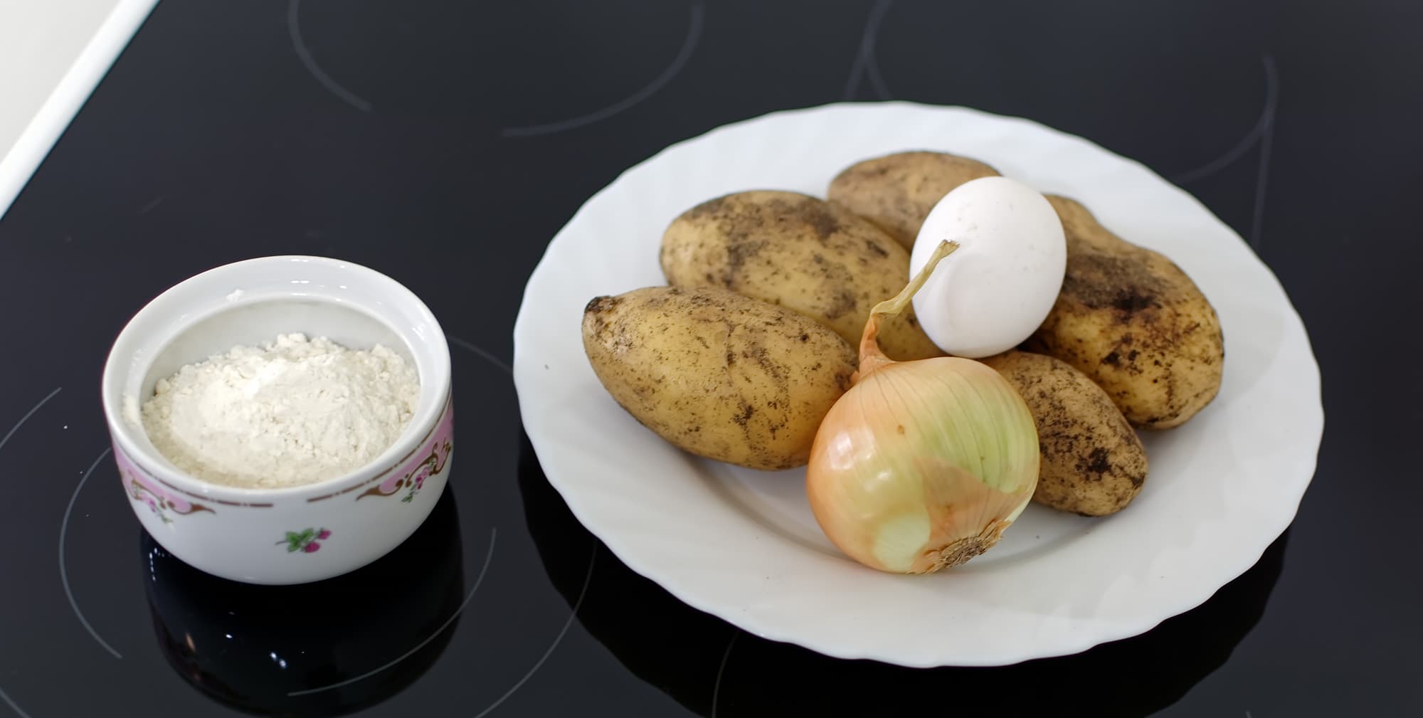 Взяли несколько картофелин, луковицу и яйцо, картофель и лук потерли на крупной терке, посолили и добавили немного муки — примерно по одной столовой ложке на каждую задействованную картофелину.