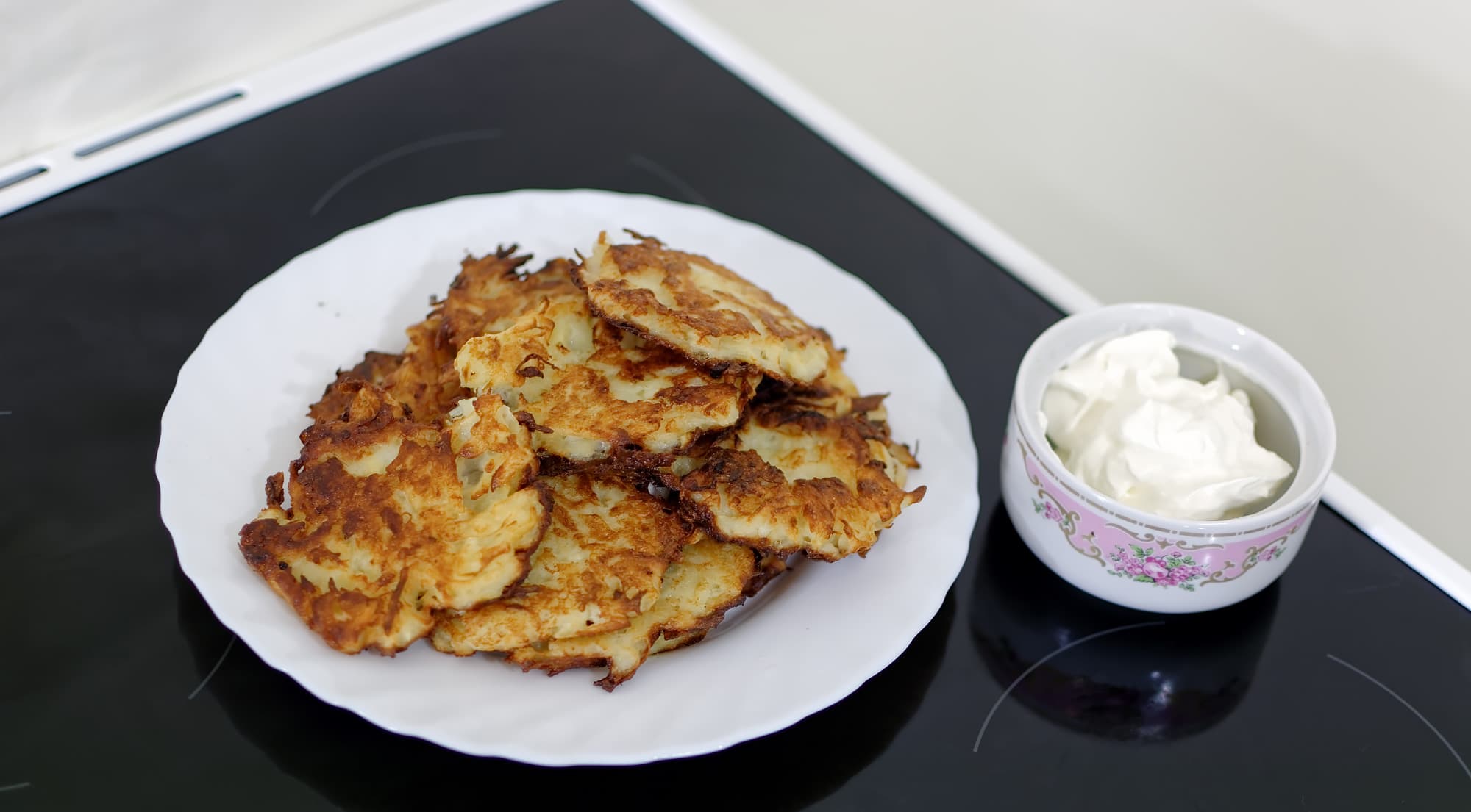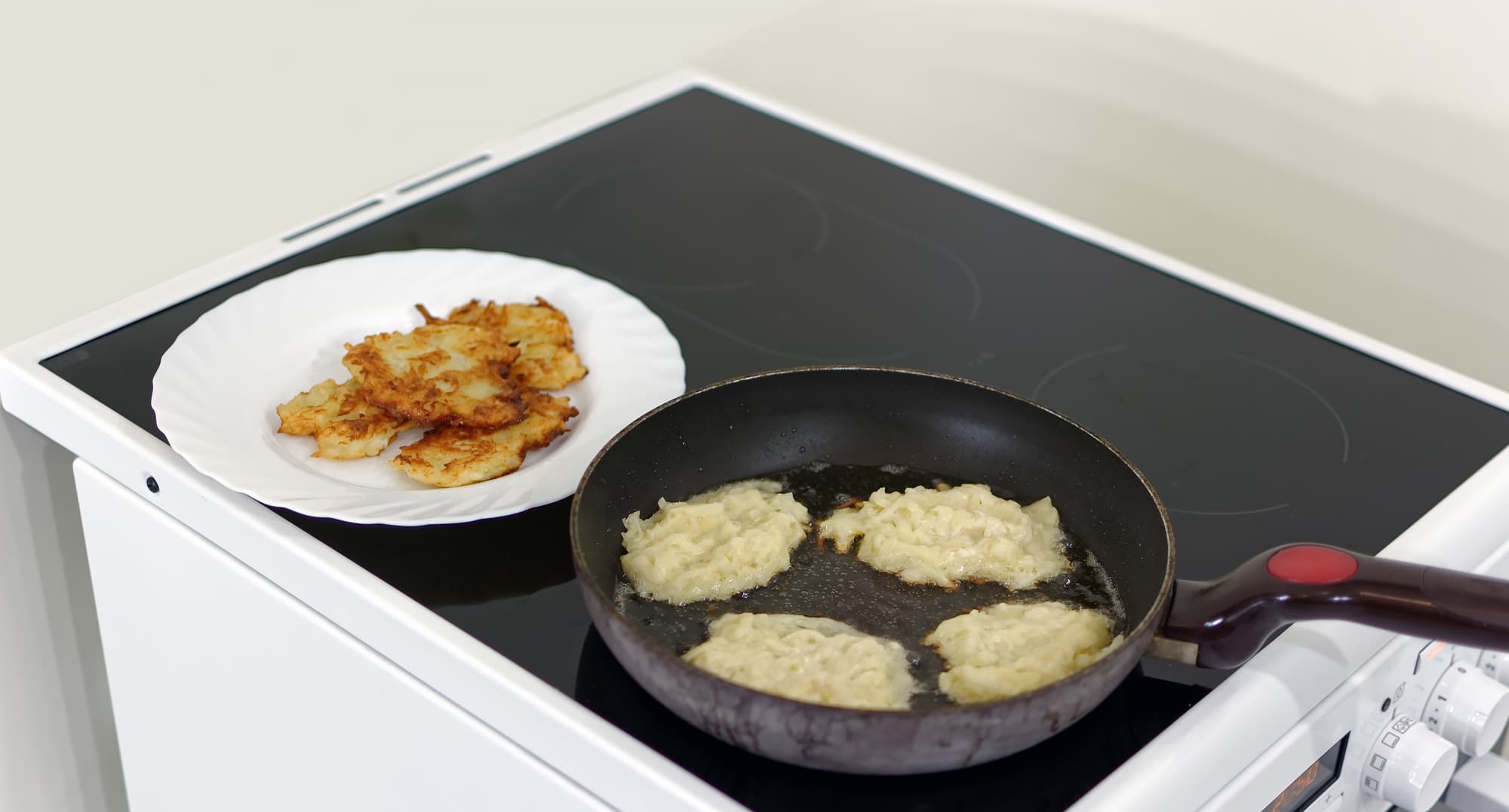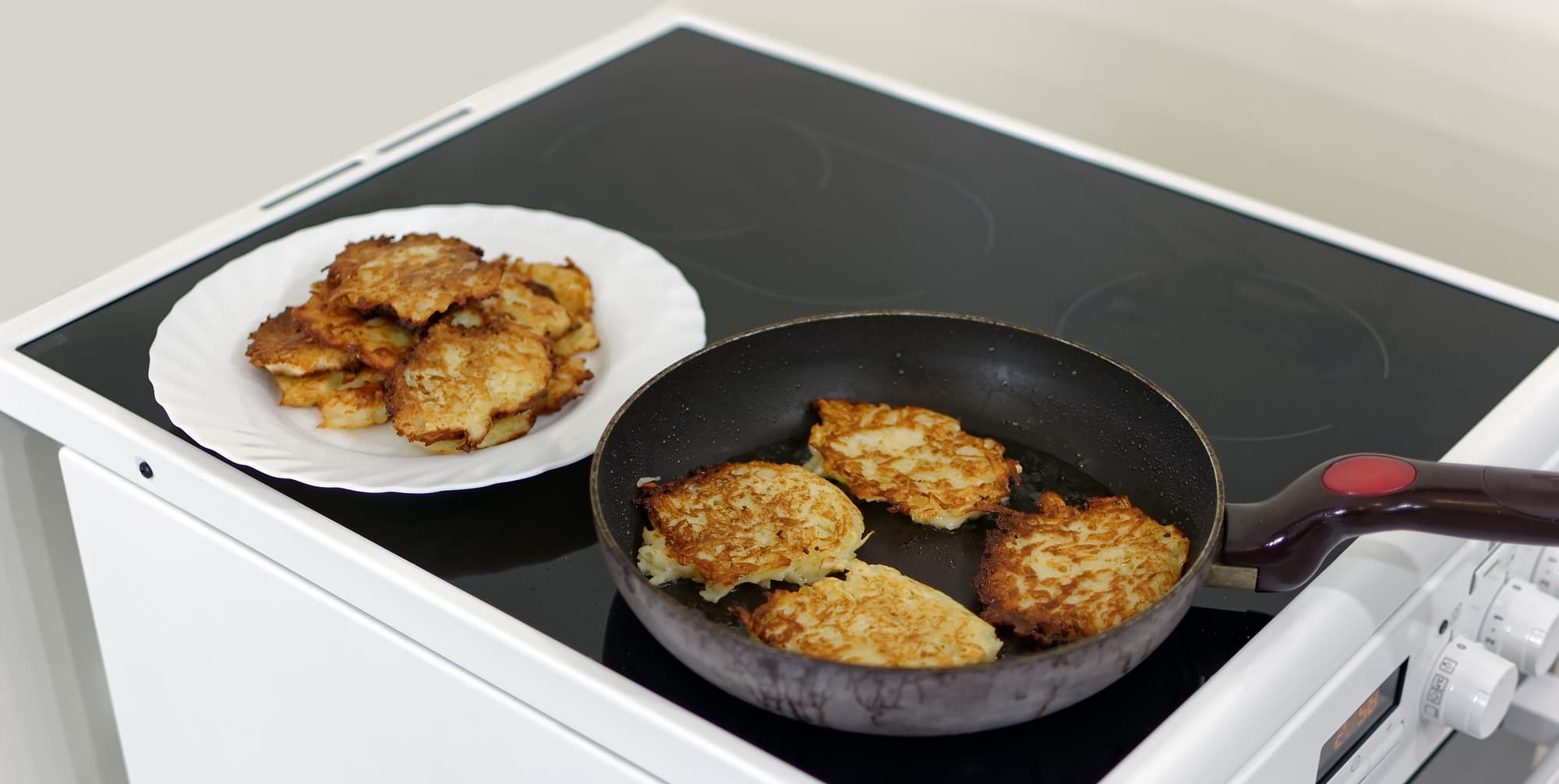 Далее мы приступили к тестированию левой нижней, то есть круглой расширяемой конфорки. Готовим простую еду — драники. Они идеально подходят, чтобы изучить интенсивность нагрева, а также то, насколько равномерно плита нагревает блюдо в середине и по краям.