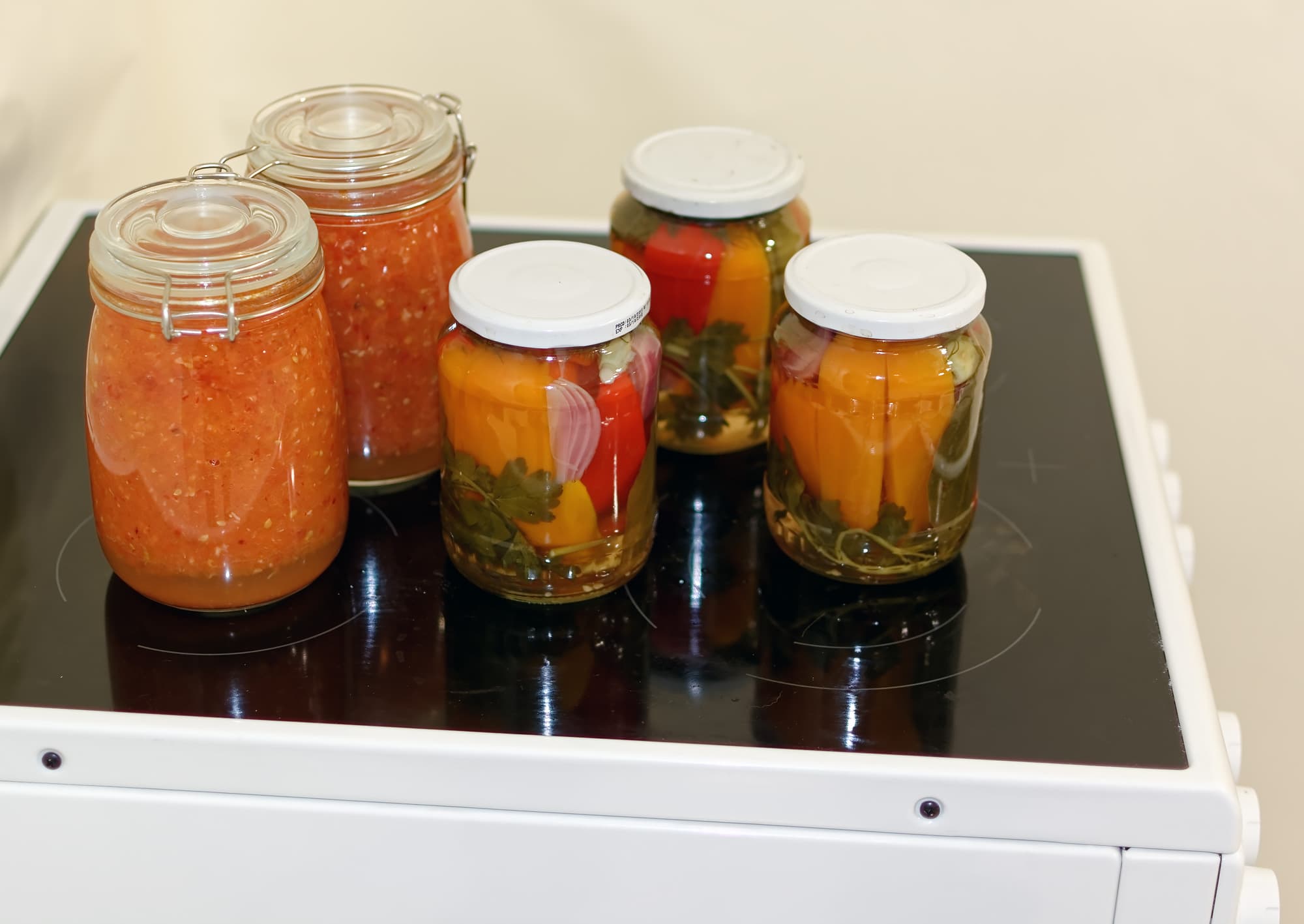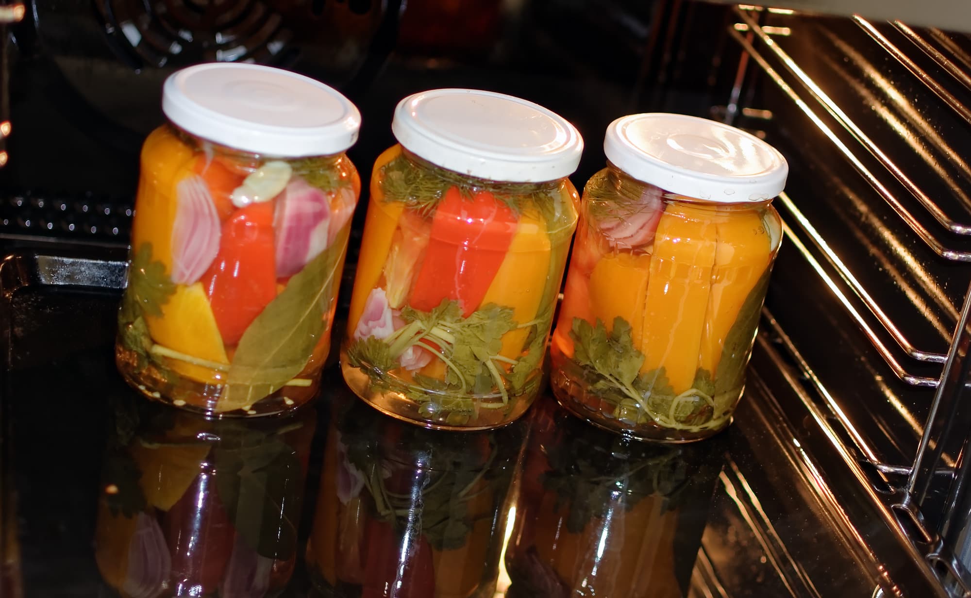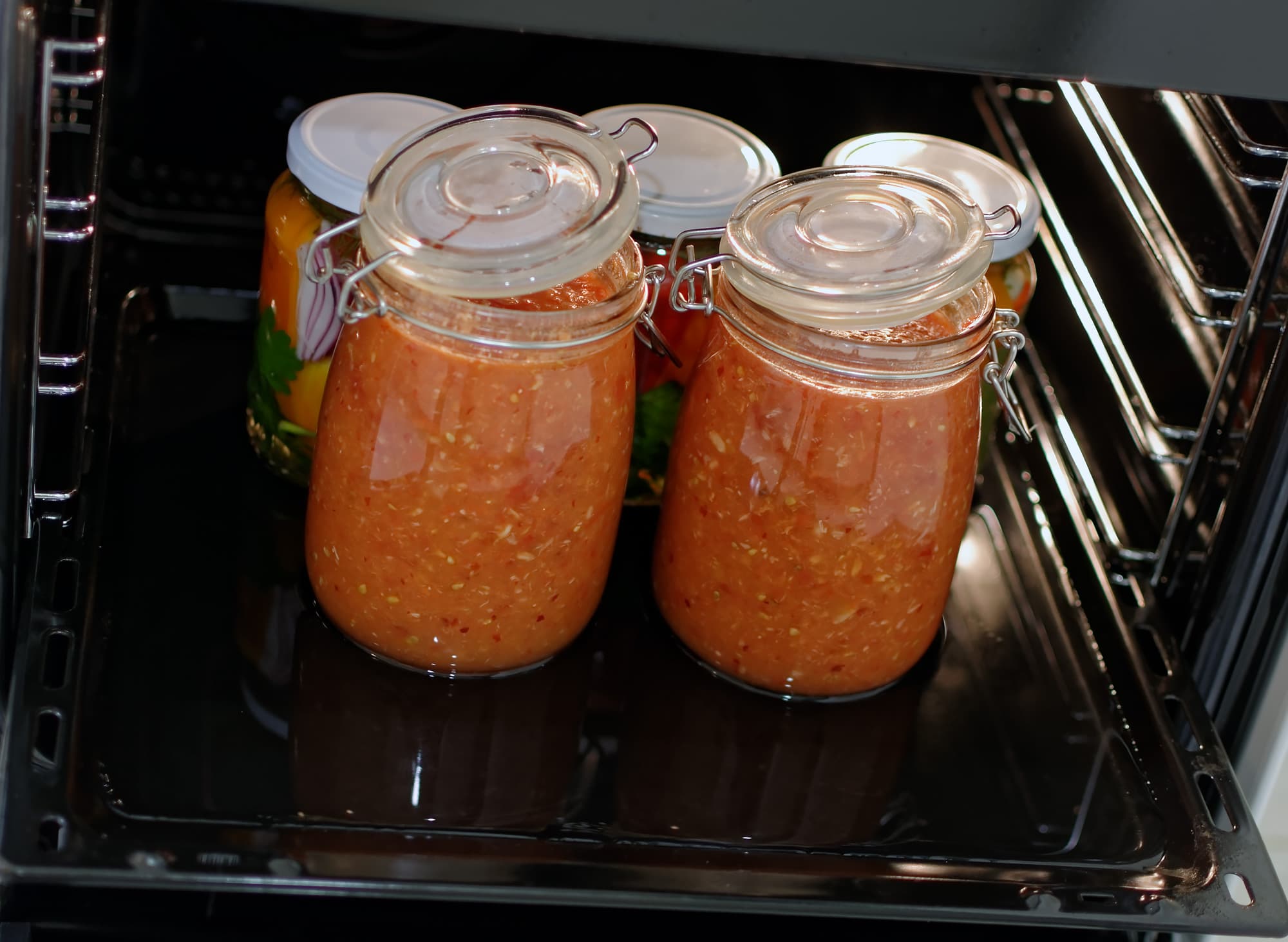 Поставили температуру 160 градусов с функцией пара. Банки внутри духовки, при этом крышки на них не закрыты — просто лежат поверх банок. Через сорок минут завершили процесс, достали банки из духовки, закрыли крышки.